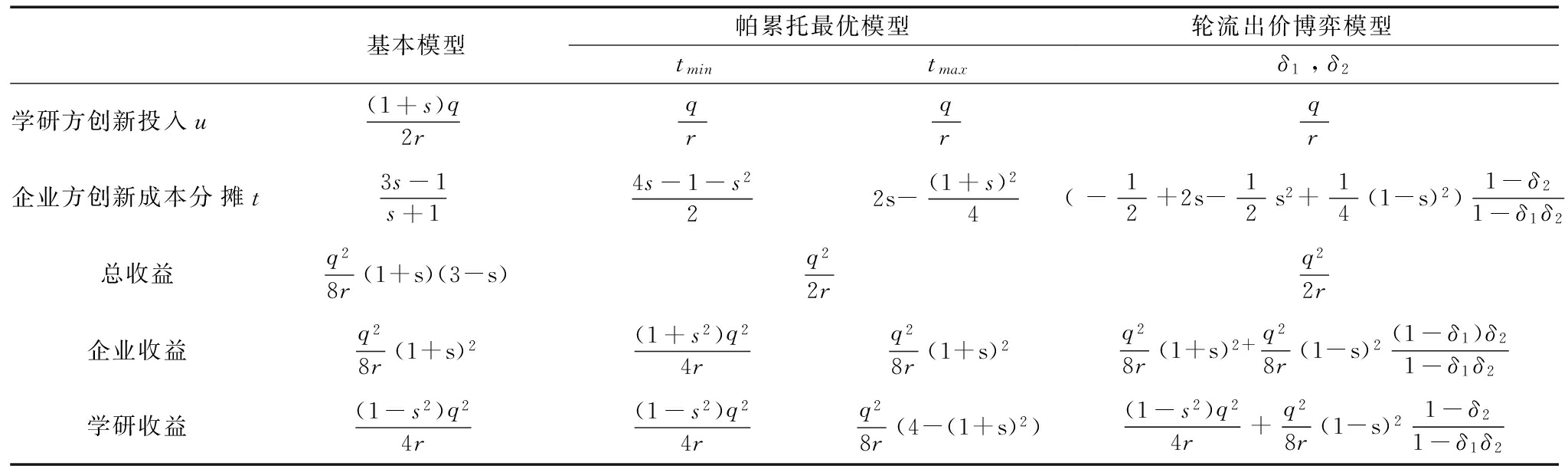 (1)创新投入u的比较。基本模型下的创新投入较低,小于q/r,而帕累托最优模型和轮流出价模型的创新投入都达到了q/r的最优程度,这是由博弈参与者不同决策方式决定的。在基本模型下,参与者的决策目标是自身收益最大化,因此存在创新投入不足;在帕累托最优模型下,参与者的决策目标是整体收益最大化,因此创新投入能达到最优水平;在轮流出价模型下,参与者先基于整体收益最大化目标增大整体收益,然后通过轮流出价方式进行收益增量的分配,因此也能达到最优创新投入水平。