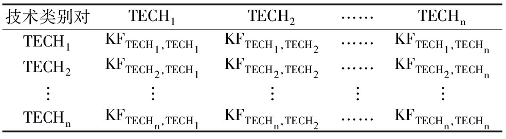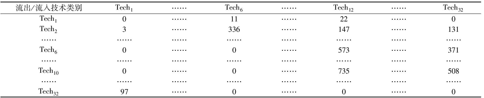 (1)借助前文提出的IPC代码与技术领域映射工具,将提取出来的IPC信息转化为相应技术类别与技术部类,即将上述步骤中专利之间的知识流动矩阵转化为技术类别之间的知识流动矩阵。表3代表了任意两个技术类别(技术类别A与B)之间的知识流动数量(KFA,B)。假设KFTECH1,TECH2为2,那么它表示从TECH1到TECH2技术知识转移数量为2。