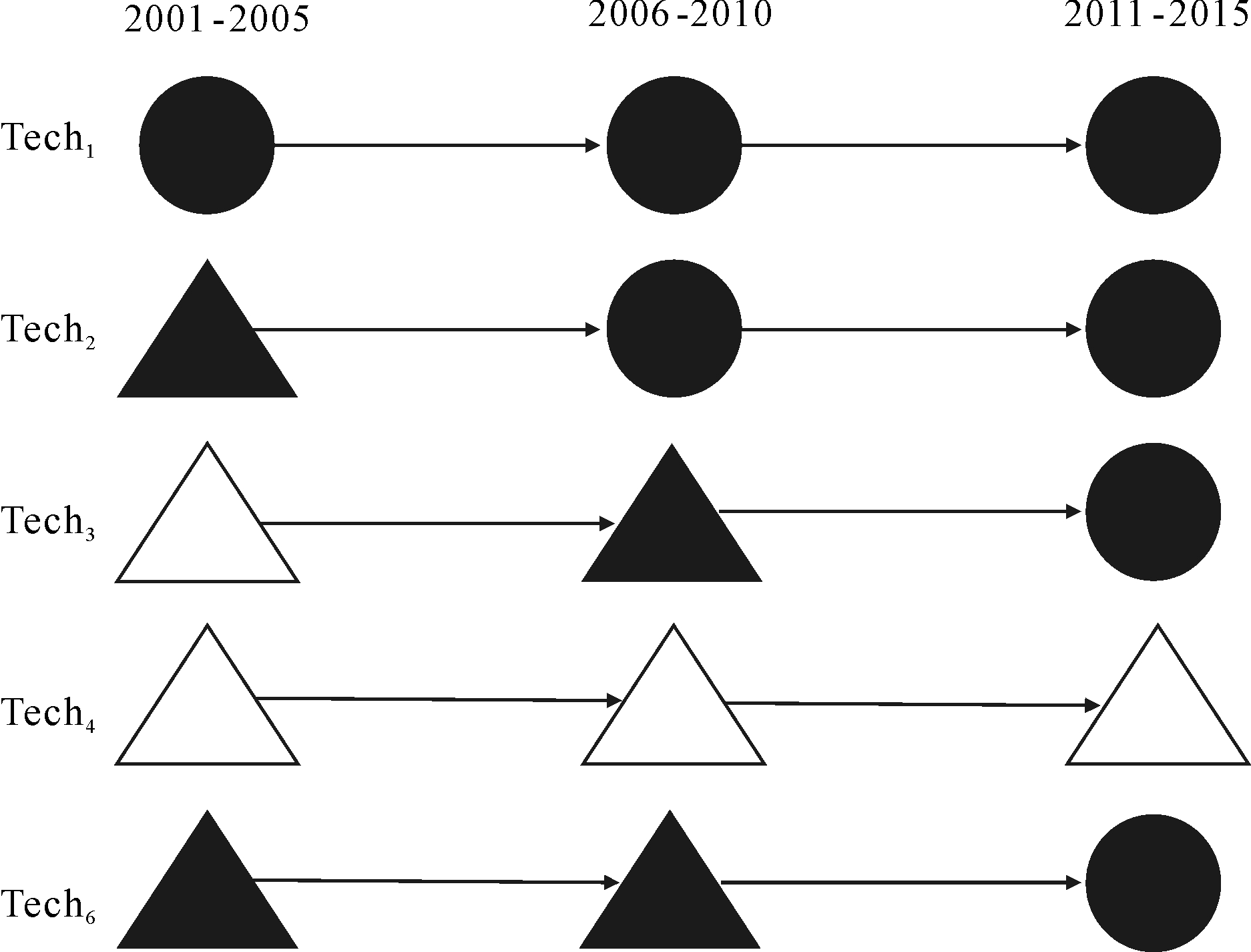 从图8中可以看出Tech1、Tech2、Tech3、Tech4、Tech6随时间推移的发展趋势,其中Tech1、Tech2参与的技术融合,其可能趋势是外部吸收,即知识流动方式以吸收外部技术知识为主,融合类型以互补性融合为主;Tech4参与的技术融合,其可能趋势是内部扩散,即知识流动方式以向外扩散技术知识为主,融合类型以相似性融合为主;Tech3与Tech5参与的技术融合,其可能趋势是以向外扩散知识为主;Tech6参与的技术融合类型是以互补性融合为主。