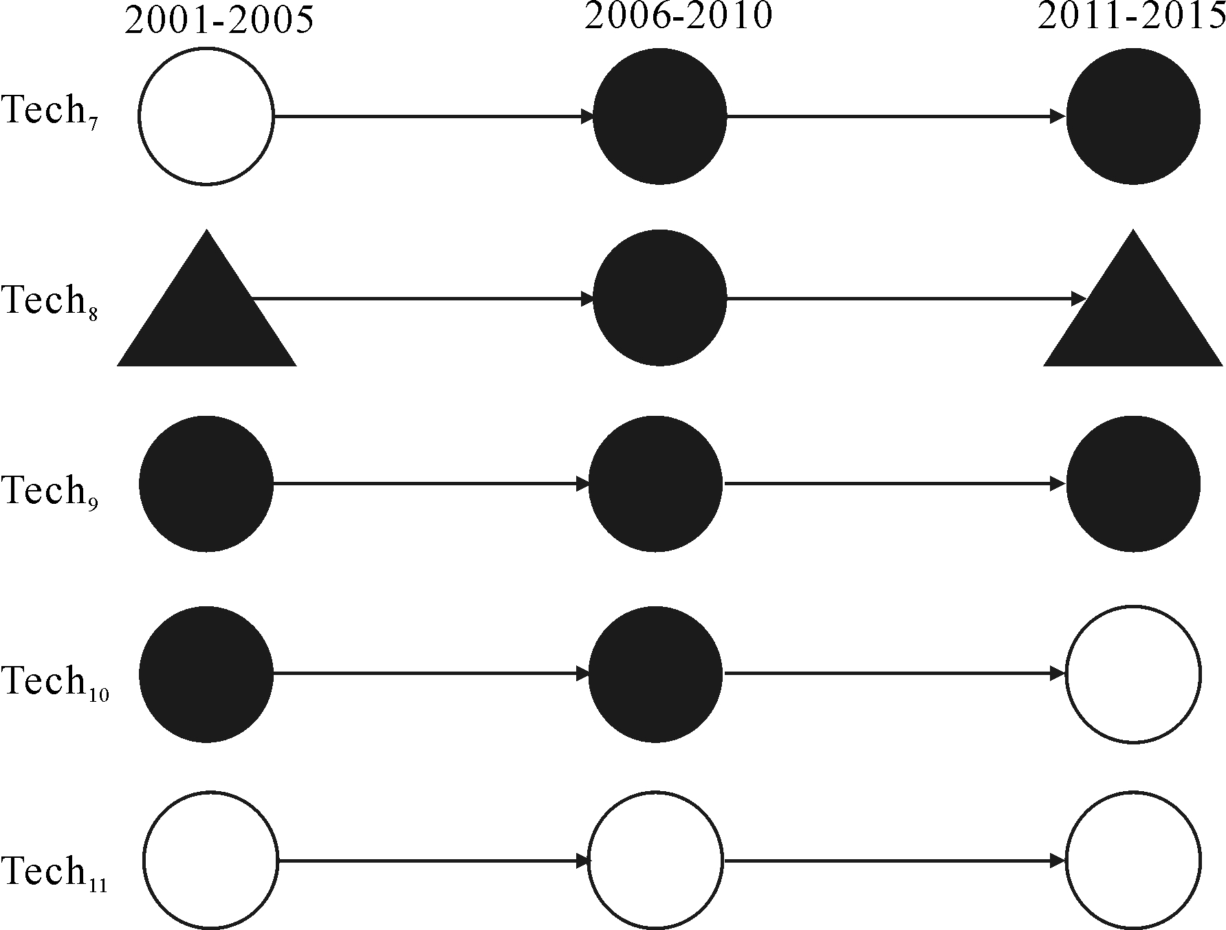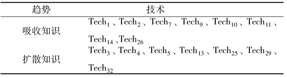 Tech1、Tech2、Tech7等参与技术融合的主要技术知识流动方向是以吸收知识为主,通过吸收外部相似性技术或跨领域技术知识发展。Tech3、Tech4、Tech5等参与技术融合的主要技术知识流动方向是以扩散知识为主,通过向外部相似性技术或跨领域技术进行技术知识扩散来发展。
