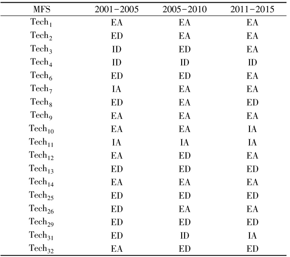 根据技术部类与流动方向上不同的数值,可以得到4种类型知识流动,对产生技术融合的每种技术分阶段计算其外部吸收、外部扩散、内部吸收以及内部扩散值,识别出每种技术知识融合的主要流动类型(MFS),再进行纵向比较,根据主要融合类型变化预测未来技术融合趋势。
