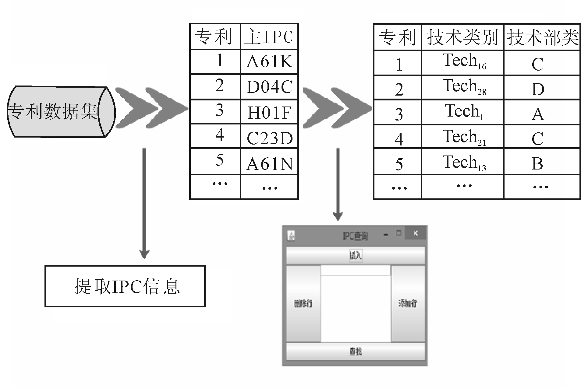 WIPO官方发布了“IPC—Technology Concordance Table”(ISI-OST-INPI分类体系),将技术领域划分为5个技术部类及5个技术部类(分别命名为A-E)下的35个技术类别(分别命名为Tech1-Tech35),覆盖了全部IPC并呈现了与IPC相关的技术类别。依据世界知识产权组织(WIPO)在2013年1月7日更新的“IPC—Technology Concordance Table”,获取专利所属技术类别,并利用Java设计了一个能够实现IPC与ISI-OST-INPI体系的分类对照工具,极大提高了专利与技术类别之间的映射效率。将所有IPC与相应技术类别数据存储到Derby数据库中,并提供了数据增加与查询接口,如图2所示,从而设计出专利与技术类别的映射工具。