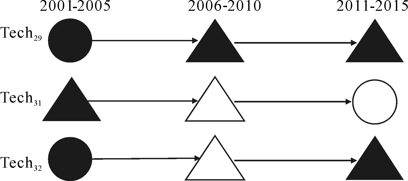 从图10中可以看出Tech12、Tech13、Tech14、Tech25、Tech265个技术融合类型的发展趋势是以产生互补性融合为主,Tech13和Tech25知识流动方式的发展趋势是以向外扩散技术知识为主,Tech14和Tech26知识流动方式的发展趋势是以吸收外部技术知识为主。
