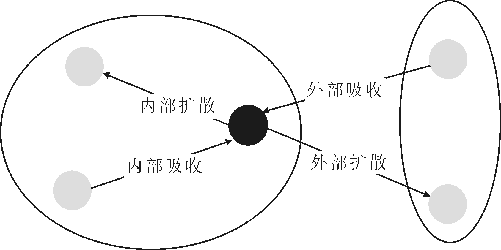 (1)知识流动动态过程分类。前文将知识流动发生在不同技术部类的技术类别之间的技术融合称为互补性融合,看作是外部活动;将知识流动发生在同一技术部类的技术类别之间的技术融合称为相似性融合,看作是内部活动。知识从一个技术类别流入到其它技术类别,对于前者来说为知识扩散活动,对于后者来说为知识吸收活动。因此,依据知识流动发生在技术类别内部或外部情况以及技术类别之间的扩散或吸收情况,可以将知识流动过程分为4种类型,即内部扩散、内部吸收、外部扩散以及外部吸收,如图4所示。