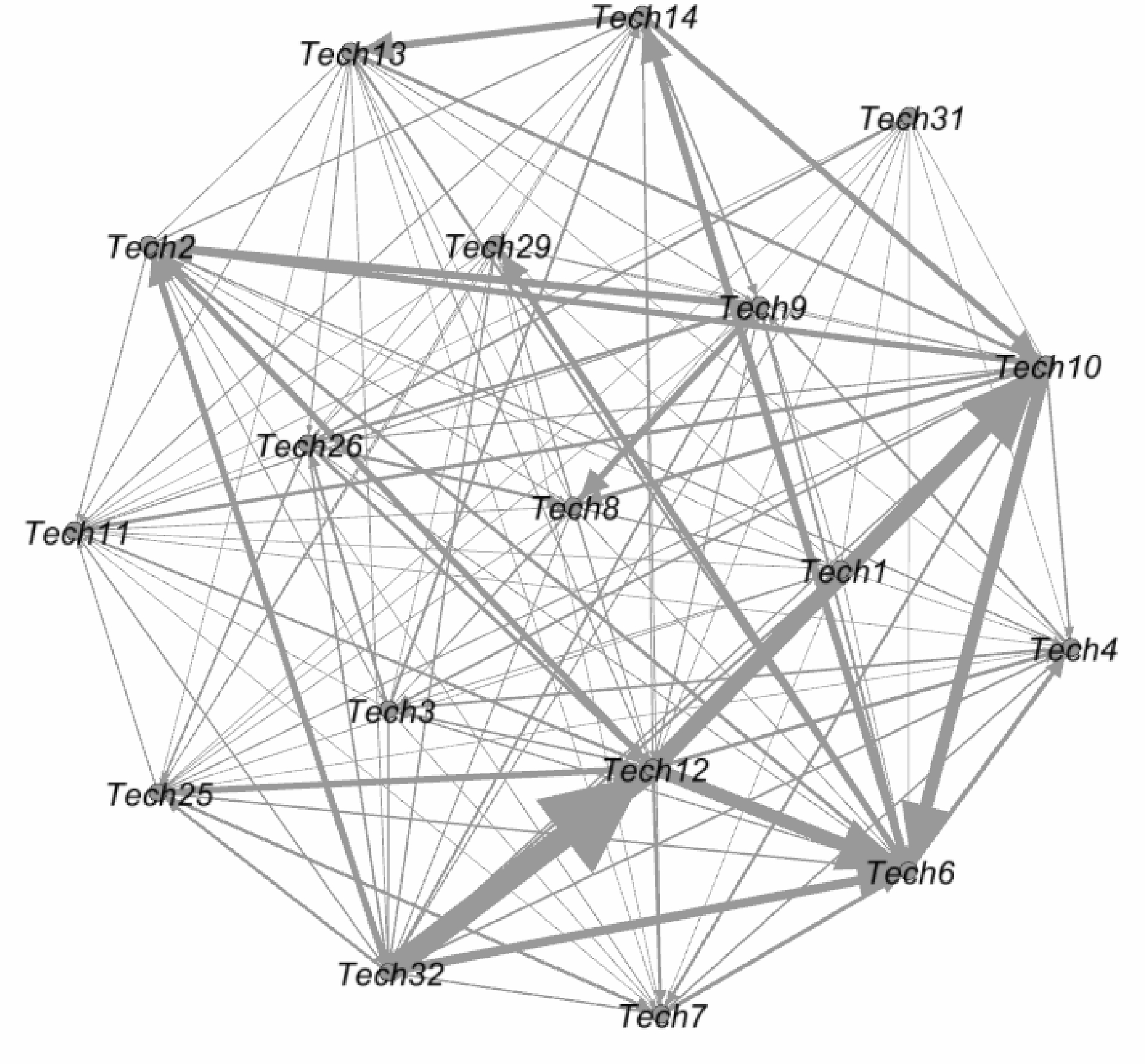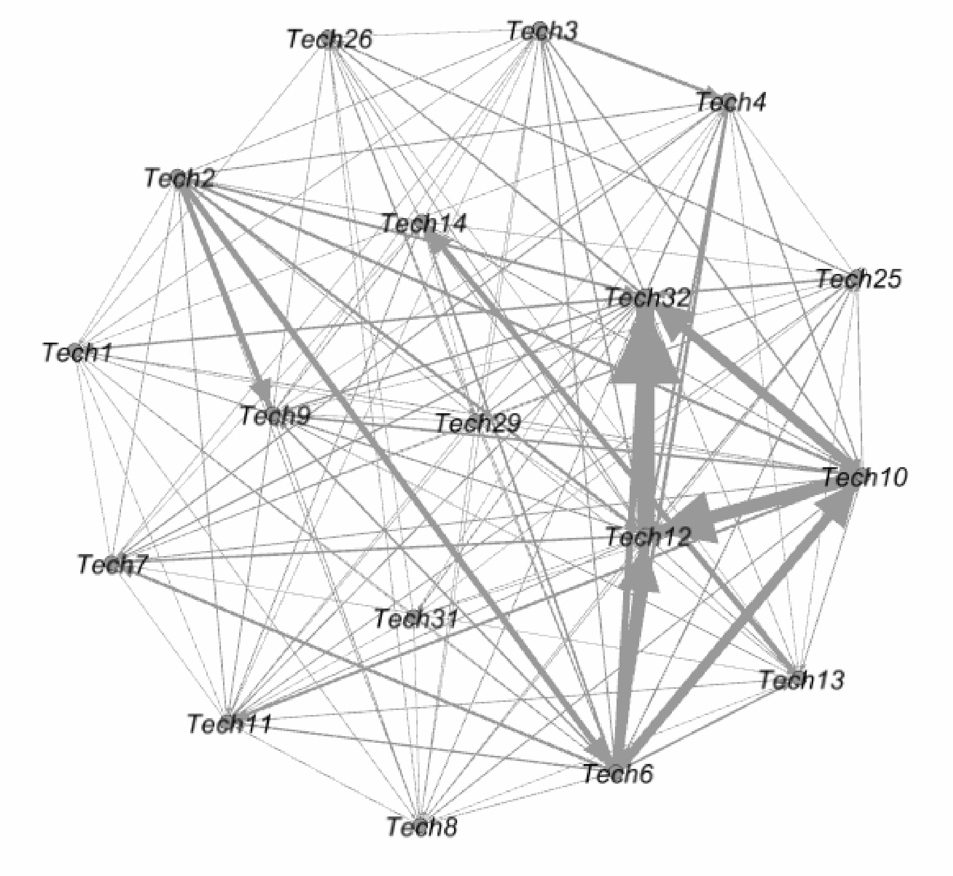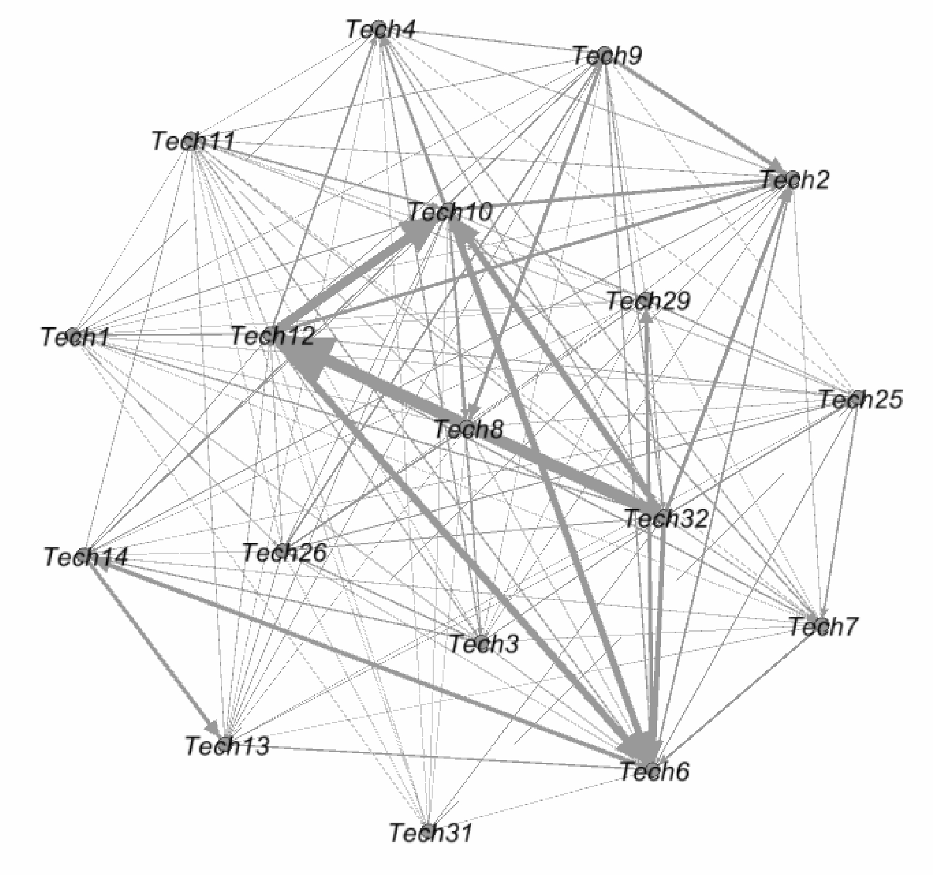 从图11中可以看出Tech29、Tech32技术知识流动方式的发展趋势是以向外扩散技术知识为主。还可以看出,未来Tech31参与的技术融合类型以相似性融合为主,未来Tech2参与的技术融合类型以互补性融合为主。