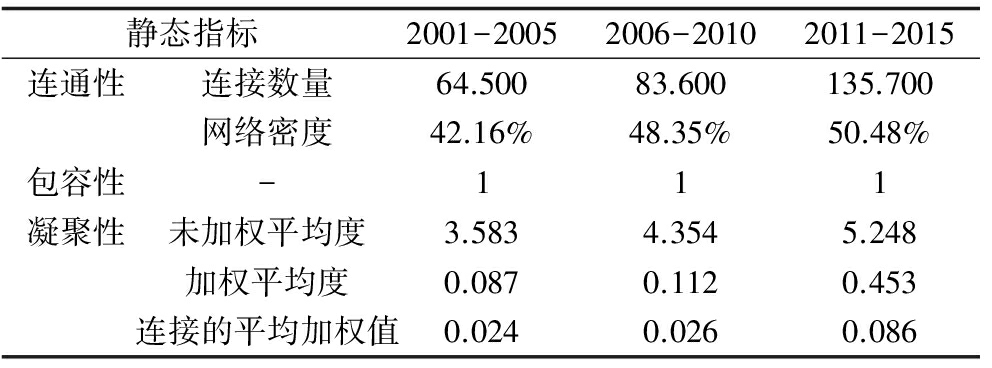 在计算静态评价结果时,使用Matlab软件分别计算3个阶段公式(1)-(6)的数值,以测度无人机领域技术融合网络的连通性、包容性和凝聚性,计算结果如表7所示。