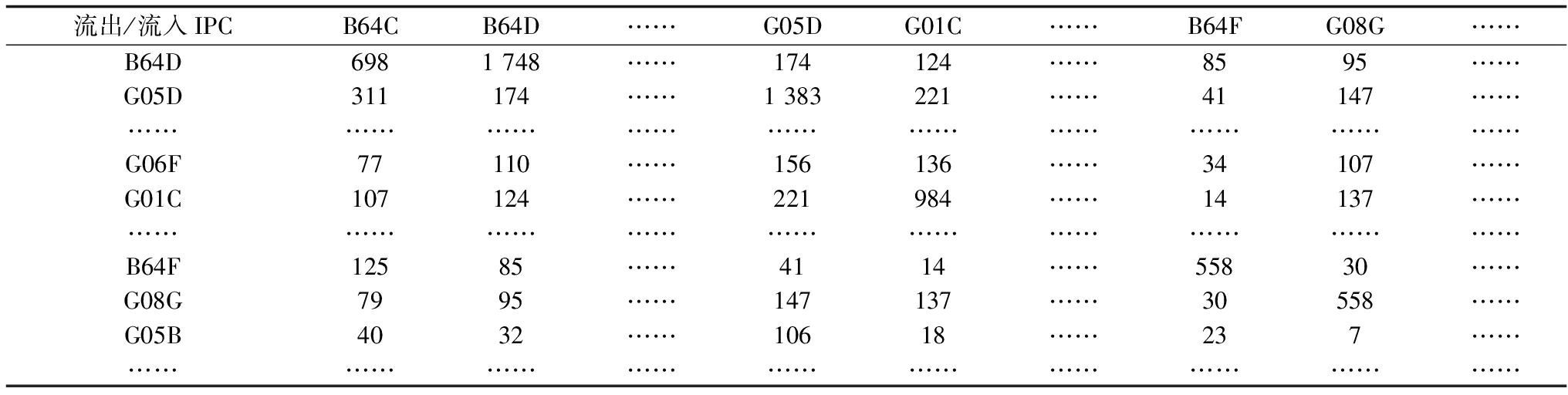 (2)提取主要专利和相关专利的IPC代码及引文信息以识别专利之间的技术知识流动。尽管每件专利有多个IPC代码,而这些IPC代码可能来源于不同的技术领域且代表不同的技术主题,但是与该专利最相关的技术知识是主要IPC代码所指代的技术领域内的知识。因此,只需要考虑用主要专利和相关专利的主IPC代码以及这些专利之间的引用信息,就能够构建任意两个IPC代码之间的知识流动矩阵即专利之间的知识流动矩阵。