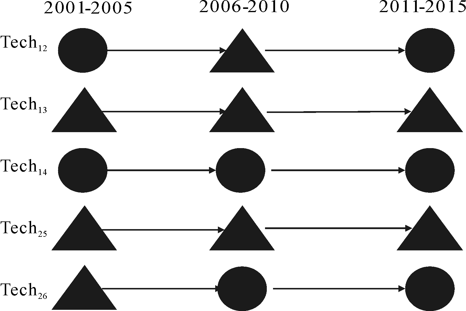 图10 Tech12、Tech13、Tech14、Tech25、Tech26的发展趋势
