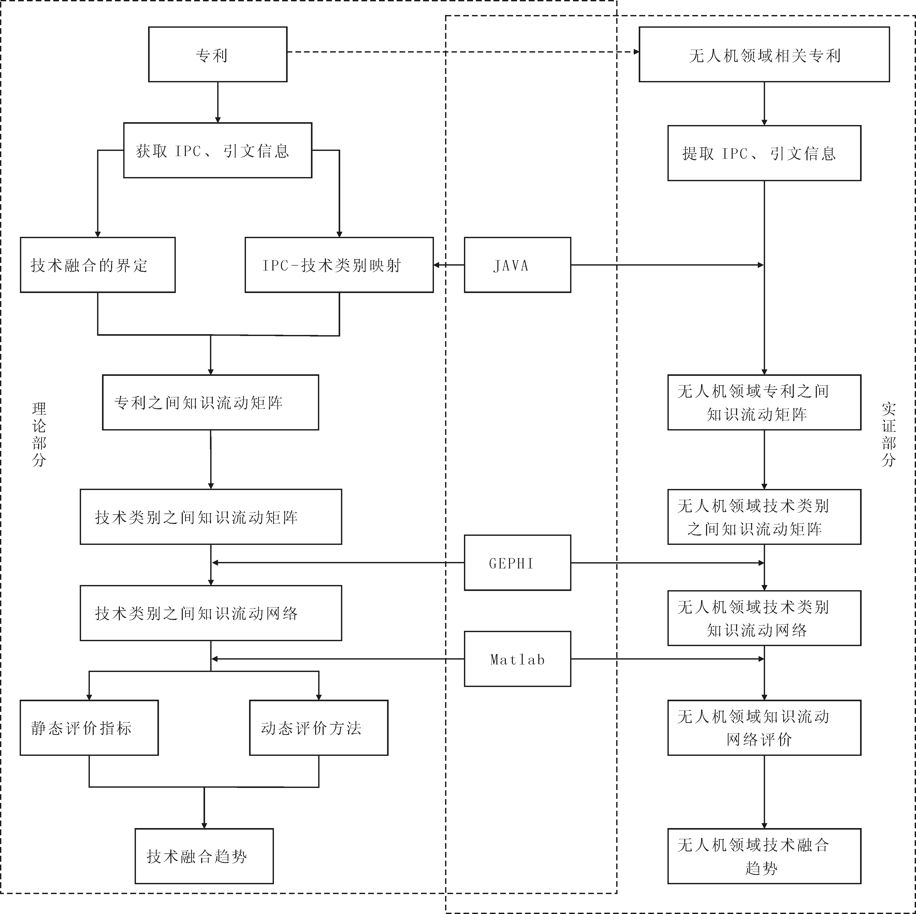 本文构建了基于知识流动网络评价的技术融合分析体系,并选取无人机领域进行实证研究,如图1所示。