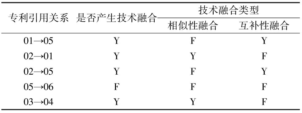 可以看出,专利01和专利02之间,专利01引用了专利02,专利01的主IPC为IPCa,专利02的主IPC为IPCb,分别属于技术类别Tech1和Tech2,是一种技术类别融合了一种技术类别的技术知识。因此,这两个专利之间发生了技术融合过程,是融合专利。具有引用关系的专利05和专利06,专利06引用专利05,专利05的主IPC为IPCc,专利06的主IPC为IPCe,尽管它们的主IPC不同,但是均属于同一个技术类别Tech9,是在同一技术类别下进行技术交流的过程。因此,这两个专利之间没有产生技术融合,说明是非融合专利。专利01引用了专利02,它们的IPC分别归属于Tech1和Tech2,Tech1和Tech2同属于技术部类A,因此专利01和专利02是相似性融合。专利05引用了专利01,它们的IPC分别归属于Tech9和Tech2,Tech2和Tech9分别来自技术部类A和B,因此专利05和专利01是互补性融合。