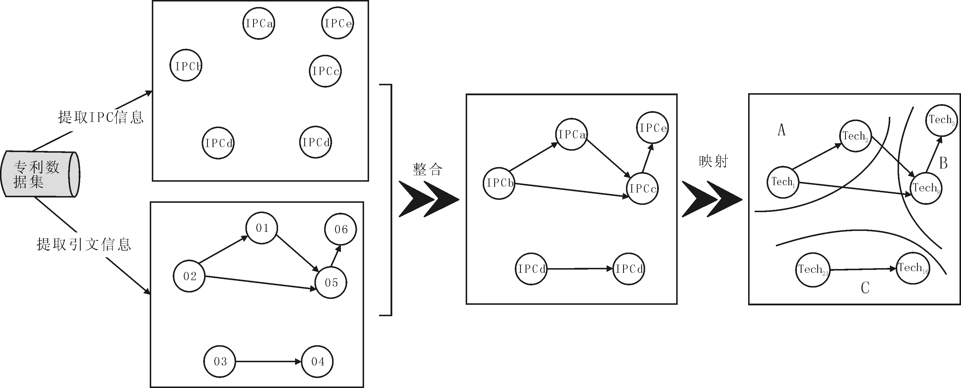 从专利角度看,技术融合实质上是代表不同类别的技术知识通过专利之间的引用关系而进行融合的过程。分析这一过程,首先要提取专利的IPC信息和引文信息(分别代表融合过程中的技术知识及知识流动方向),然后对两类信息进行整合,实现每个专利IPC与技术领域间的映射,得到技术类别间的引用关系。