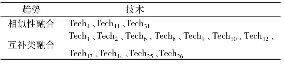 Tech4、Tech11、Tech31参与的技术融合类型的发展趋势是以相似性融合为主,这3个技术类别是通过借鉴、利用和融合相近技术领域知识或者被相近技术领域借鉴、利用和融合的方式发展。Tech1、Tech2、Tech6等参与的技术融合趋势以互补性融合为主,这11个技术类别是通过借鉴、利用和融合跨领域技术知识或者被跨领域技术借鉴、利用和融合的方式发展。