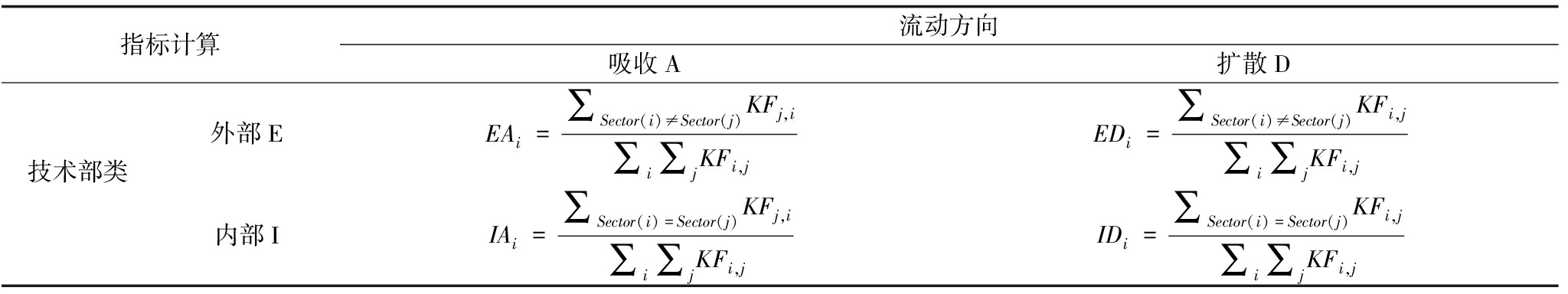 (2)知识流动过程动态指标计算。图4中的节点表示一个相关技术类别,两个节点之间的弧表示知识流动,箭头代表流动方向,弧的强度代表流动强度。一个节点的外部吸收(EA)代表该节点所代表的技术类别从其它产业部类的技术类别中吸收的知识数量,其测度可以通过计算产业边界外部向内弧线的权重求和实现。外部扩散(ED)代表相关技术类别传播到其它不同产业部类的技术类别知识数量,其测度可以通过计算向外弧线的权重求和实现。内部吸收(IA)和内部扩散(ID)则代表同一产业部类内技术类别之间的知识流入和流出数量,其测度可以利用同一产业部类内部相关节点向内和向外弧线的权重求和实现。每一个指标的计算方法如表4所示。