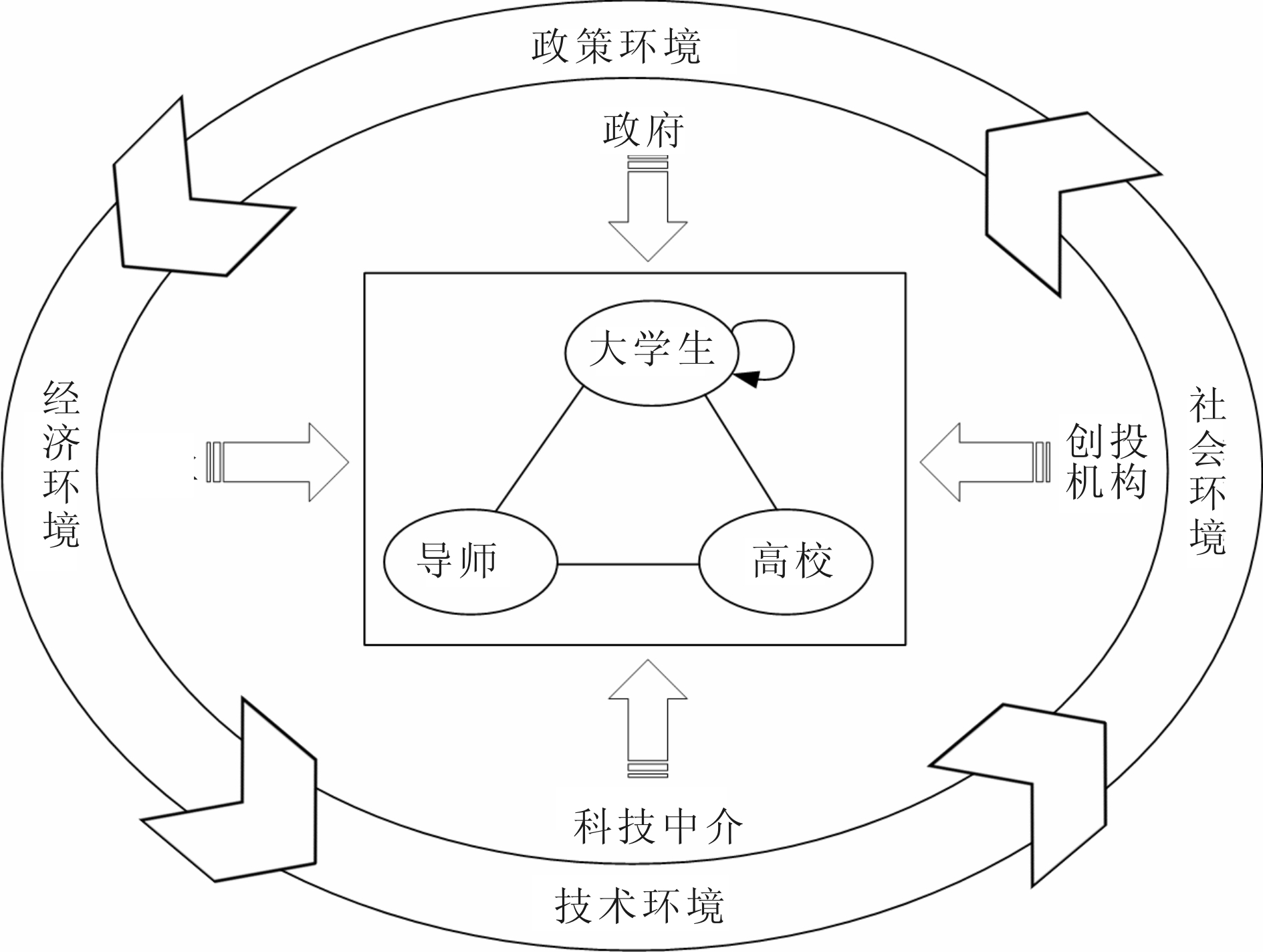 作为高校创业教育功能的延伸,创客空间不仅鼓励、培育和催化了创新思想和理念,还为大学生创客创业创新提供了场所、设备等创业资源要素以及专业化服务,有力保障了大学生创新创业活动的持续开展。同时,由于高校创客空间自身资源有限,还需联合企业、创投机构和科技中介等组织,共同促进大学生创客将创意转化为产品和财富。可见,高校创客空间不仅是物理空间,更是关系空间,在这个创客实践场中,大学生创客之间、创客与导师之间以及创客与其它组织之间不断进行着物质、信息、知识等要素的传递与交换[8]。因此,本文认为,高校创客空间是将大学生创客聚集到一起,利用外部各类主体的支持,协作参与创新创业项目而构成的一个创业创新生态系统(如图1所示),该系统与复杂适应系统(CAS)的内涵和特性具有较高的契合度。