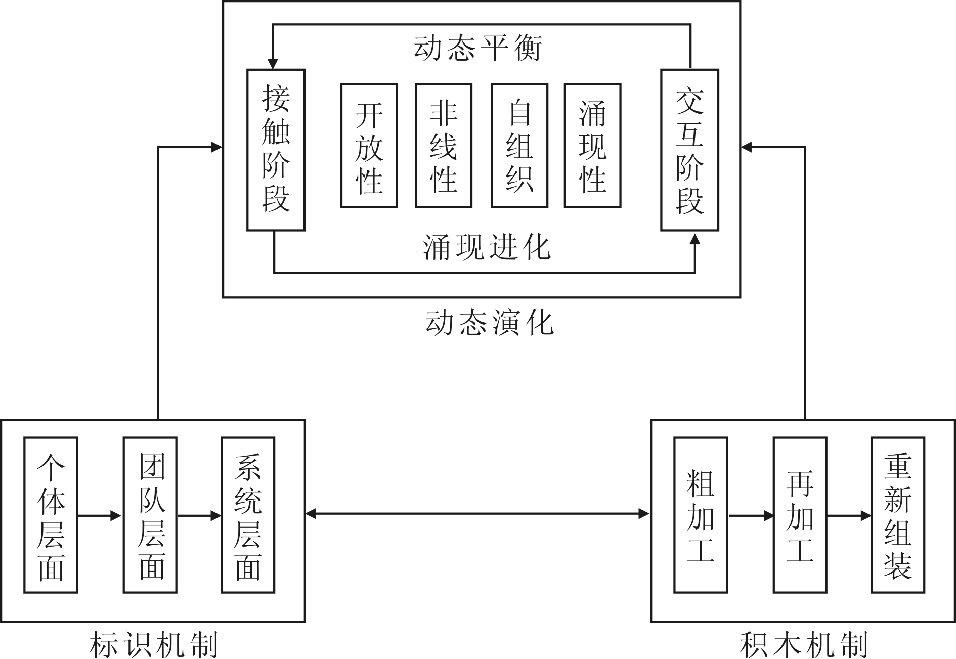 基于上述分析,高校创客空间系统的开放性、非线性、自组织性和涌现性体现出复杂适应系统特征,该系统的动态演化过程包括适应性主体接触阶段和交互阶段,前者主要基于标识机制,有助于提高主体间分工协作效率,后者通过积木机制形成系统涌现,以实现创客空间系统优化并适应外部环境变化。据此,本文提出整合分析框架如图2所示。