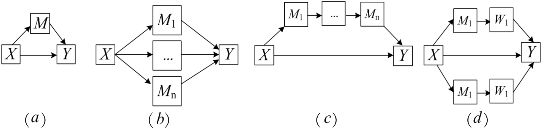 由于现实问题的复杂性和多样性,自变量X除对因变量Y产生直接影响外,还可能通过第三变量M对因变量产生间接影响,这种介于自变量X和因变量Y之间的第三变量M称为中介变量。温忠麟[13]指出,近年来中介效应模型被广泛应用于心理学和其它社科领域,相比于单纯分析自变量对因变量影响的同类研究,中介效应模型还可以分析自变量对因变量影响的过程和作用机制。中介效应模型包括简单中介效应模型和多重中介效应模型。简单中介效应模型是指自变量X和因变量Y之间只存在一个中介变量(见图2(a)),多重中介效应模型则是在自变量X和因变量Y之间存在多个中介变量,这些中介变量之间的关系可能是并行的(见图2(b))、有顺序的(见图2(c)),也可能是复合式的,既有并行关系,又有链型关系(见图2(d))。