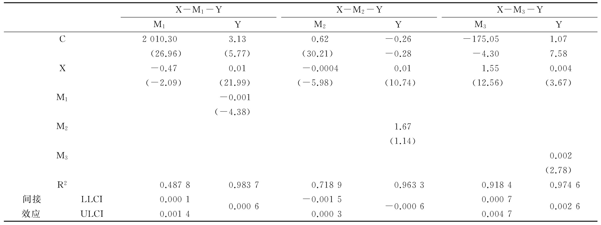 表1X分别通过M1、M2、M3到Y的中介效应