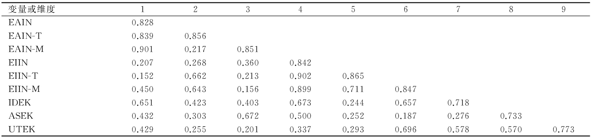 剔除不合格指标后继续进行数据分析,相关结果如表1所示,可以看出所有变量的Cronbach's α均大于0.7,引用Nunnally[43]的标准,说明完善后的量表信度水平很高。同时,所有变量的平均方差提取(AVE)均大于0.5,按照Fornell[44]提出的标准,所有变量均满足聚敛效度。由表2变量间的相关系数矩阵可以看出,除了探索式创新与挖掘式创新及其技术维度和市场维度外,所有变量间的相关系数均小于变量自身AVE的平方根,按照Fornell[44]提出的标准可知,变量之间具有良好的区分效度。