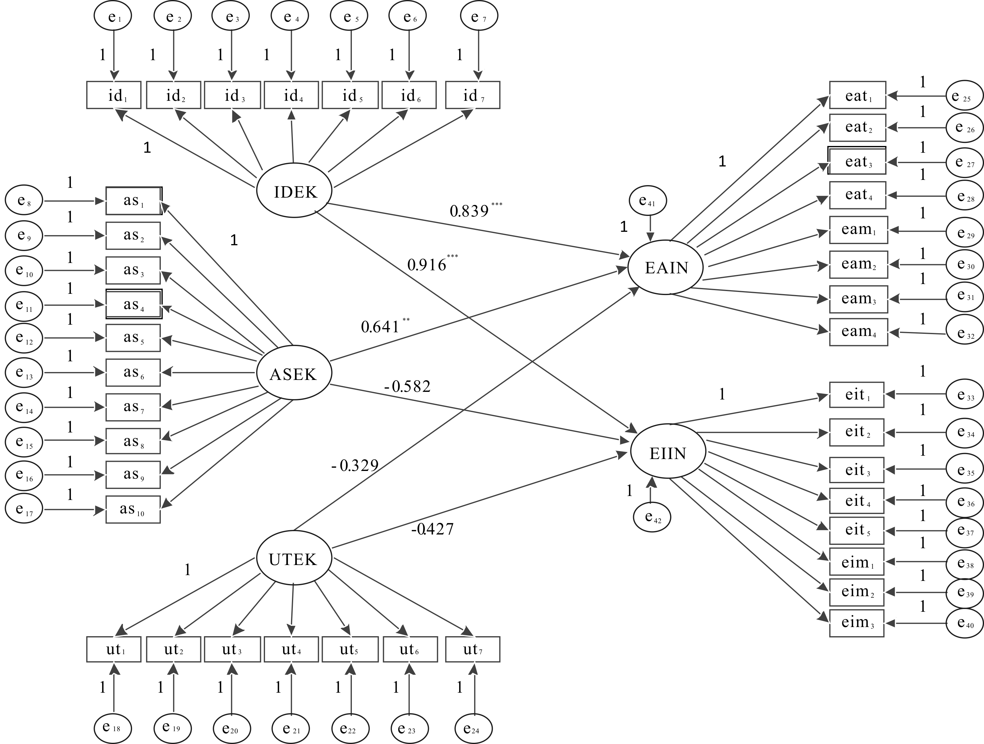 图2为AMOS计算后的模型回归结果,从中可以看出,个人外部知识识别(IDEK)对企业探索式创新(EAIN)有显著正向影响(β1a=0.839,p<0.01),因此H1a得到验证;个人外部知识识别对企业挖掘式创新(EIIN)有显著正向作用(β1b=0.916,p<0.01),H1b得到验证。个人外部知识同化(ASEK)对企业探索式创新有正向影响(β2a=0.641),但是显著性水平下降(p<0.05),因此H2a得到验证;个人外部知识同化企业挖掘式性创新有负向影响(β2b=-0.582),但是结果并不显著,H2b通过假设检验;个人外部知识应用(UTEK)对企业探索式和挖掘式创新都存在负作用(β3a=-0.329,β3b=-0.427),但是系数检验结果均不显著。因此,H3a没有通过假设检验, H3b得到验证。