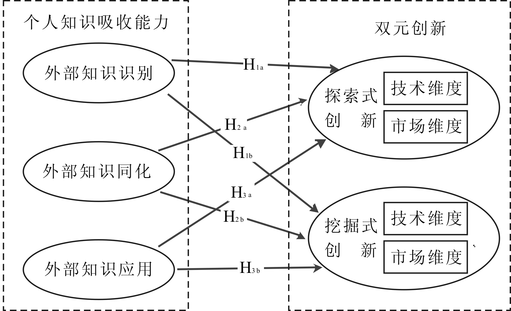 通过外部知识源丰富企业知识基础能够促进创新[23]。为了充分利用外部知识,成功的探索式创新和挖掘式创新要求较强的知识吸收能力,而这建立在个人认知、激励、行动和交流的基础上[24]。个人知识吸收能力是对外部新知识的识别、同化和利用[3]。