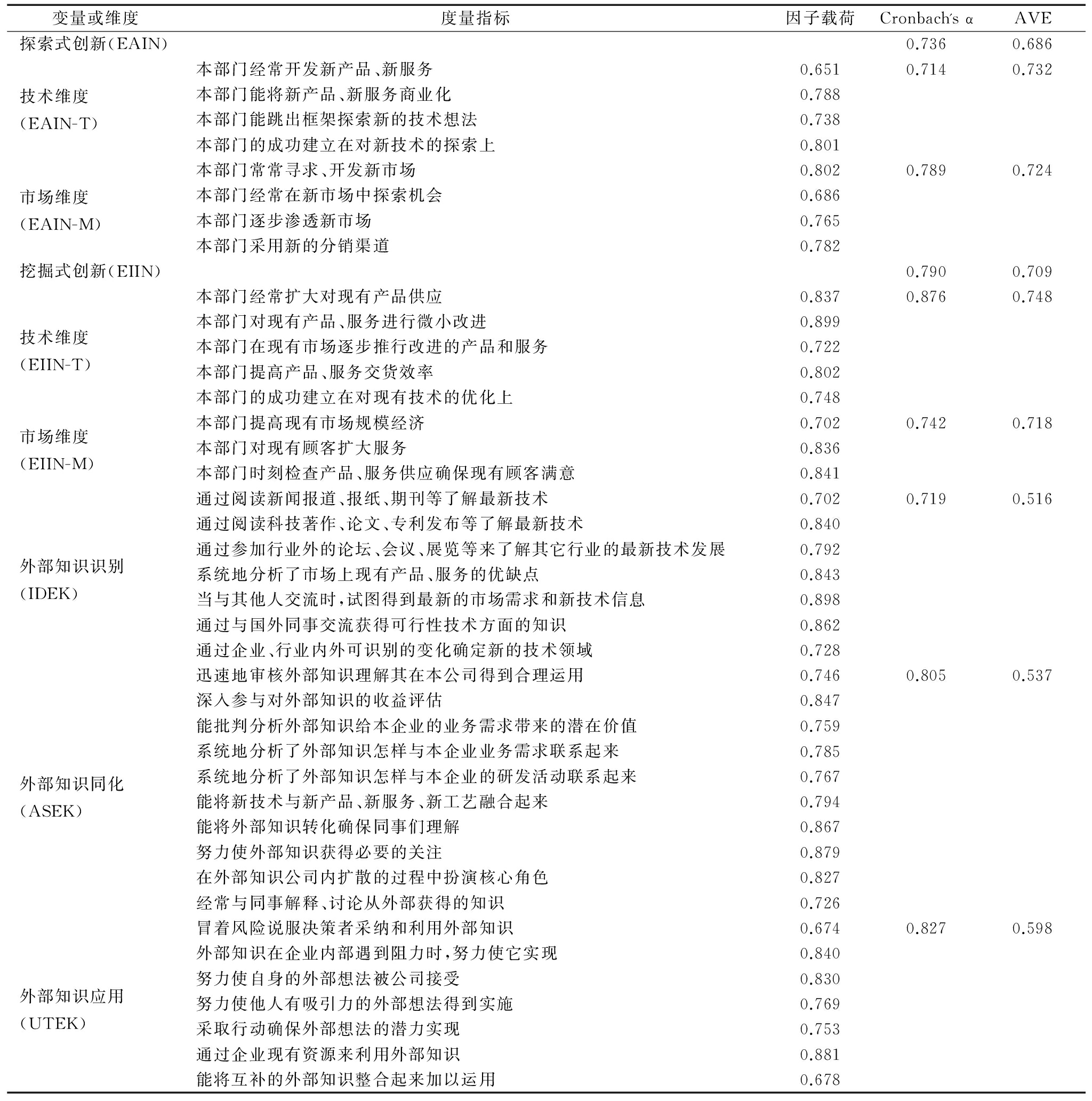 本文通过AMOS和SPSS统计软件进行数据分析,对于变量内部结构检验,根据Duarte[42]与陈晓萍等[39]的研究,指标因子载荷均大于0.7或者同一变量下某一指标因子载荷大于0.5,其它指标因子载荷均很高,说明指标信度可以接受,能作进一步分析。依照该标准,剔除了因子载荷不合格的指标:探索式创新的技术维度剔除了3个指标,市场维度剔除了1个指标;挖掘式创新的技术维度剔除了1个指标,市场维度剔除了1个指标;外部知识识别剔除了5个指标。