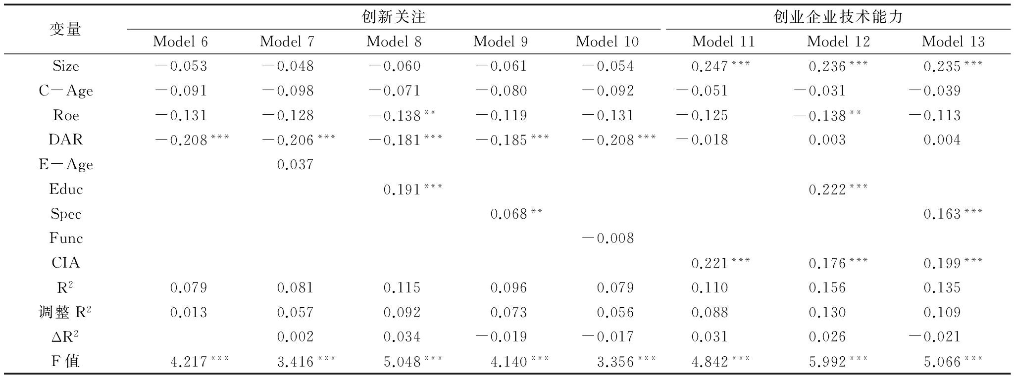 通过对自变量到因变量、自变量到中介变量关系的检验可知,企业家学历、职业背景不满足自变量到因变量和自变量到中介变量双向显著相关的条件,所以,假设H4a、H4d未得到验证。然后,按照上述中介效应检验方法,将自变量(学历、教育专业)分别和中介变量(创新关注)同时引入模型12、模型13。结果显示,学历、教育专业对创业企业技术能力的影响均通过了显著性检验(P<0.05),β值分别为0.222、0.163,相比模型3、模型4中的β值(0.255、0.189)均变小,说明引入自变量后两者之间的相关性明显变弱,因此,假设H4b、H4c得到验证,且创新关注在企业家学历、教育专业与创业企业技术能力之间起部分中介作用。