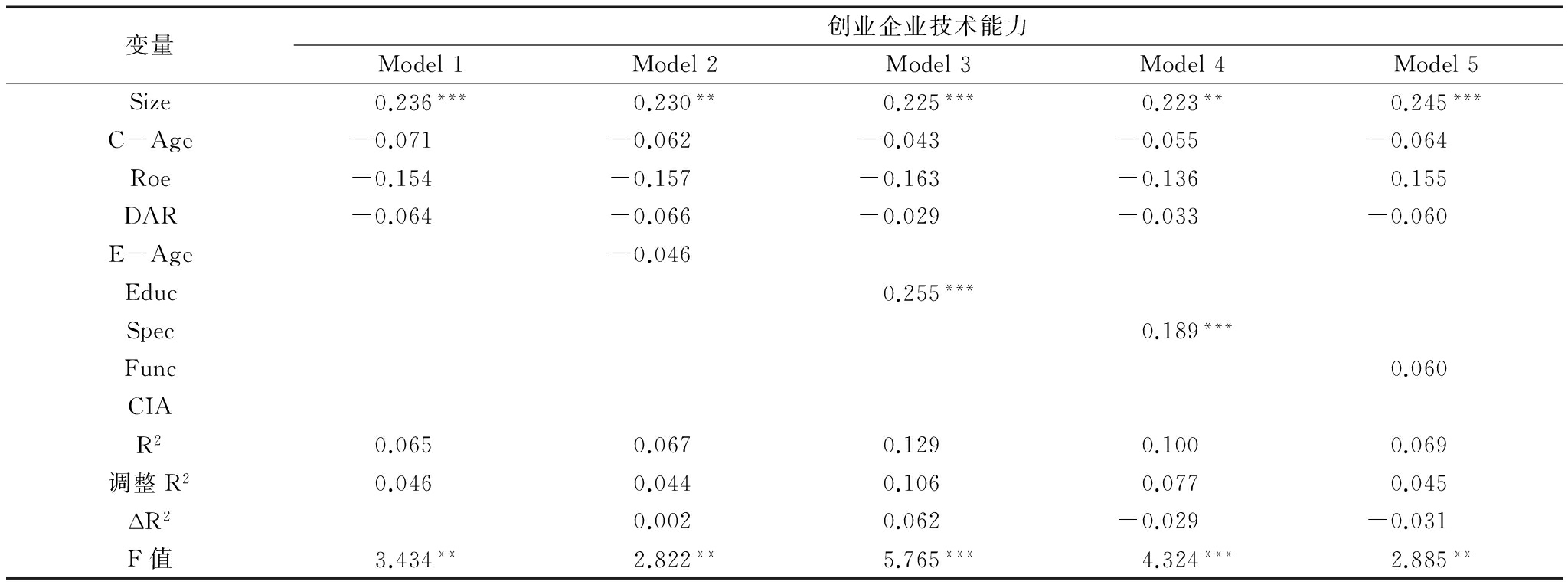 本文采用多元线性回归方法,验证企业家背景特征与创业企业技术能力之间的假设关系。其中,模型1仅包含控制变量;模型2—模型5分别将企业家背景特征变量年龄(E-Age)、学历(Educ)、教育专业(Spec)、职业背景(Func)引入回归模型,检验其与创业企业技术能力之间的假设关系。企业家背景特征对创业企业技术能力影响的模型数据如表3所示。模型2、模型5显示企业家年龄、职业背景对创业企业技术能力没有显著影响,因此,假设H1a、H1d没有得到验证。模型3、模型4即企业家的学历、教育专业(β值分别为0.255、0.189,P<0.01)对创业企业技术能力有显著正向影响,因此,假设H1b、H1c得到验证。