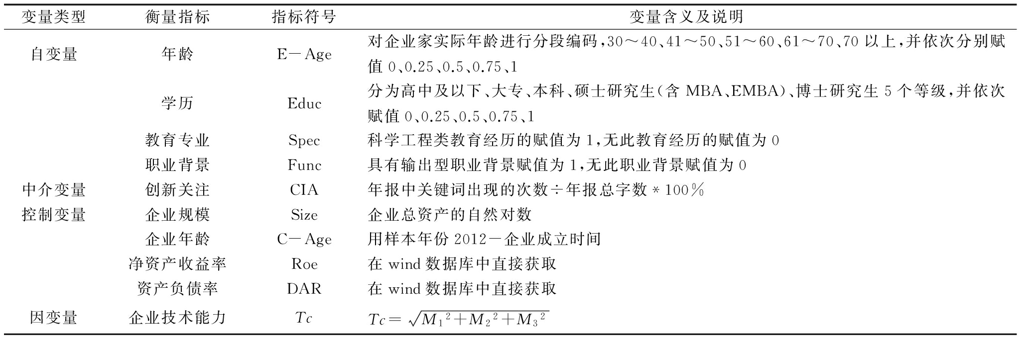 根据以往研究,企业规模(Size)、企业年龄(C-Age)、净资产收益率(Roe)和资产负债率(DAR)对企业创新产生、能力提升及管理决策都有一定的影响作用[25]。因此,将企业规模、企业年龄、净资产收益率、资产负债率作为控制变量。具体测量方法如表1所示。