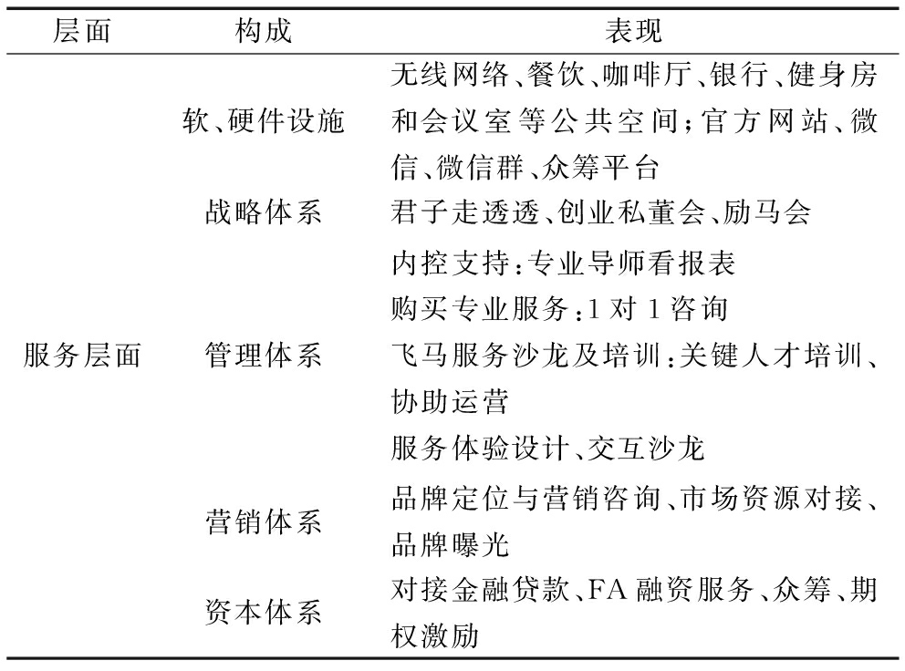 空间遴选优质企业并逐渐形成多层次立体化服务体系,包括软硬件设施、战略、管理、营销和资本5个方面,如表3所示。