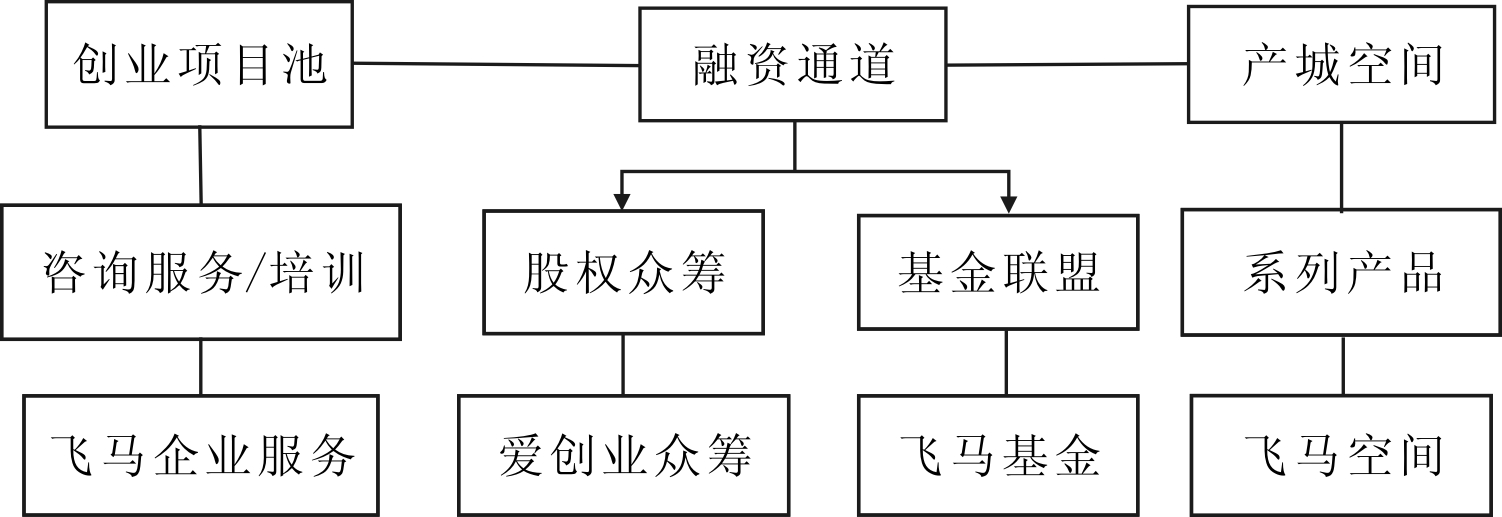 飞马旅集团成立于2011年9月,以众创空间为主体业务,主要架构包括4个方面:飞马企业服务、飞马空间、爱创业众筹和飞马基金,如图2所示。飞马空间在全国内地9个城市共拥有超过30万的12个创业空间,在上海有3个园区,分别位于嘉定区、静安区和青浦区。空间的20%重点针对初创期和孵化器企业,60%吸纳有一定创业基础并拿到内外部投资的企业,剩余20%是快速成长企业,集结优势资源,在全国范围内打造大型创业综合体。