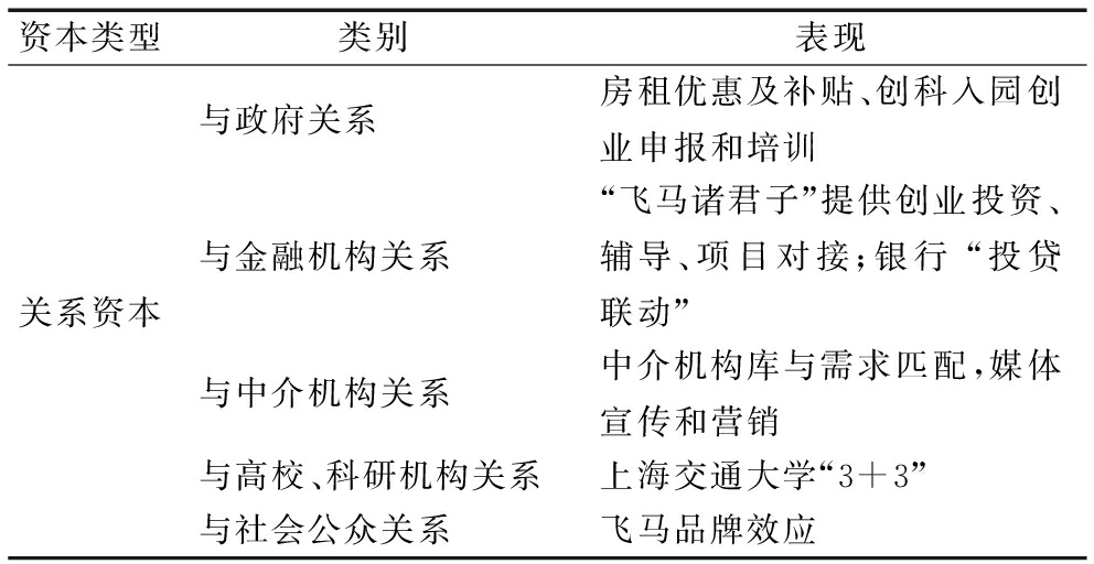 (3)关系资本。环境的动态性与复杂性使得空间各类关系更迭反复,5i center意识到关系资源的重要性,主动积极寻求关系资源,通过与利益相关者之间的交易互动,逐渐构建稳定、长期的合作关系网络,如表4所示。“飞马诸君子”身为天使投资人或来自金融机构,如赛富基金、真格基金、宏泰基金、红杉资本等机构,他们关注创客创业前端,提前对创客进行创业辅导与投资,解决初创企业融资难问题;中国银行、商业银行等机构对创客实行投贷联动,放宽部分贷款限制。这一关键关系资本成为空间发展的支持性力量及其区别于其它空间的竞争优势。空间与上海交通大学等建立了合作关系,进行“3+3”深度合作:一是场地资源共享,鼓励上海交通大学的优质创业团队入驻,进行孵化;二是创新孵化平台共建;三是与交大合作共建飞马学堂和创新创业大讲堂,引进优质人才与科研项目。与高校和科研机构的关系资本是空间发展的动力。空间十分重视与政府的联系,政府对空间给予前两年免租优惠以及补贴,对空间企业进行入园创业申报指导和培训等,从而完善空间服务体系,对空间起激励作用。建立中介机构库,采用向入驻创客推荐模式,不签订合作协议,根据创客特点和需求的特殊性,将库中机构与需求相匹配,让创客自由选择。与腾讯网、第一财经、新浪财经、新华社等50多家知名媒体机构进行合作。除帮助创业企业融资外,还帮助项目做好媒体宣传和营销工作。飞马旅连锁品牌效应也成为促进创客成功的重要关系资本。