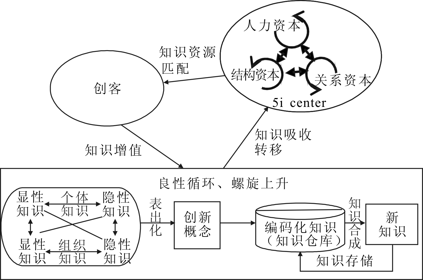 如图3所示,众创空间智力资本协同创新实质上是创客利用众创空间提供的丰富智力资本进行知识协同创新的过程。创客基于知识需求产生获取知识的欲望与动力,通过对接空间提供的智力资本资源获取知识并进行匹配,达到自身知识的积累和转化,通过积累的知识理解和解决目标问题,在此过程中不断与其他创客、空间或资源主体进行交流,补充和修正自己的知识,将空间组织知识和个体知识不断进行隐性知识和显性知识转化,从而实现知识创新。