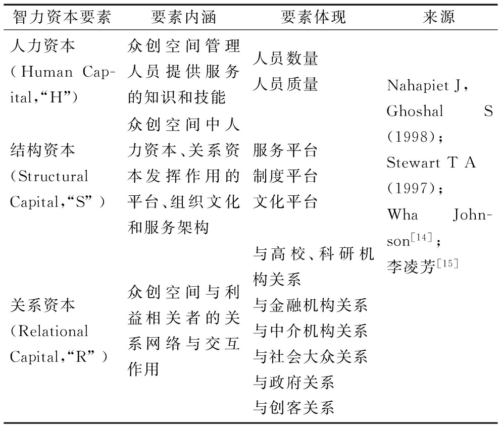 众创空间作为一种新业态组织形式,是一个知识集合体,其知识存量决定创客资源配置能力、知识认知能力和创新能力,也决定其需要依赖于组织内、外部知识和能力驱动创新。智力资本是众创空间获得可持续竞争优势的动力,是价值创造的核心,也是实现众创空间生产经营目标的无形资产。据此,本研究将智力资本概念与众创空间相结合,构建众创空间智力资本结构,如表2所示。