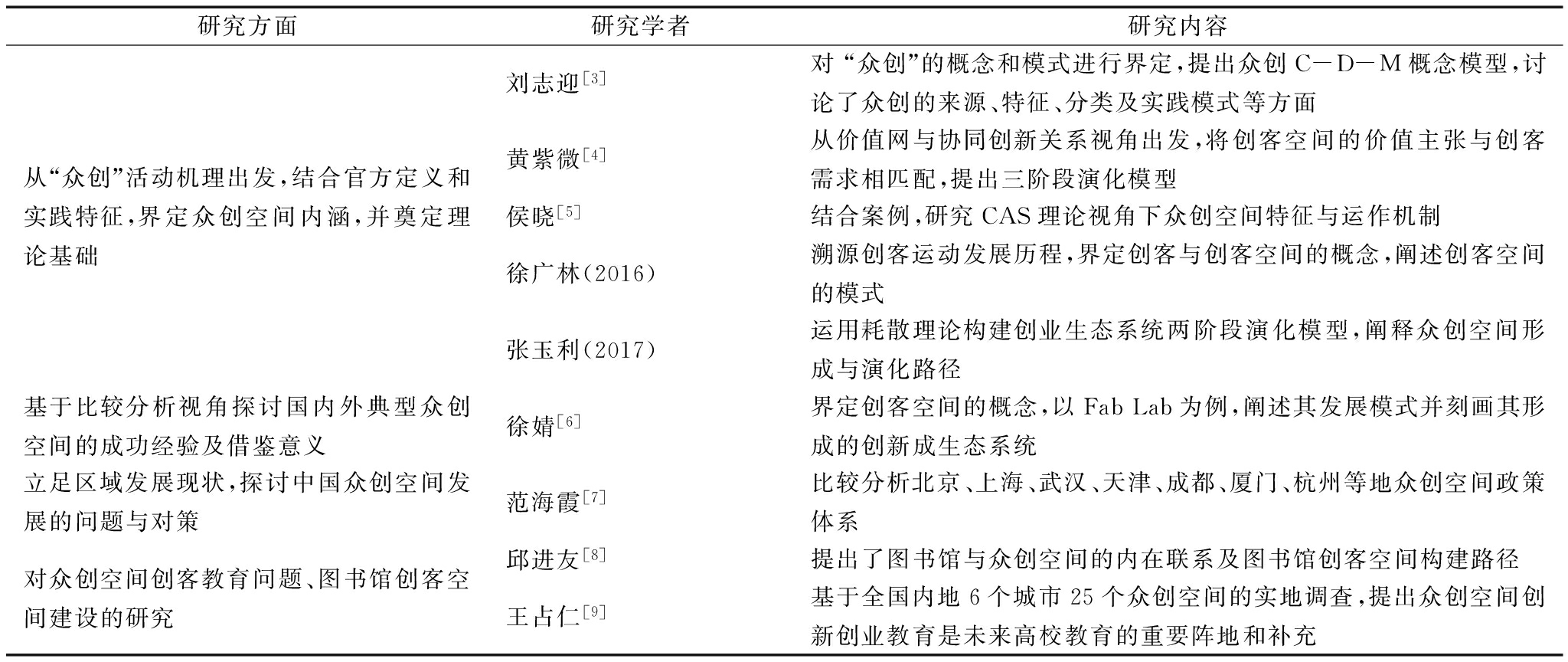 表1众创空间国内研究现状