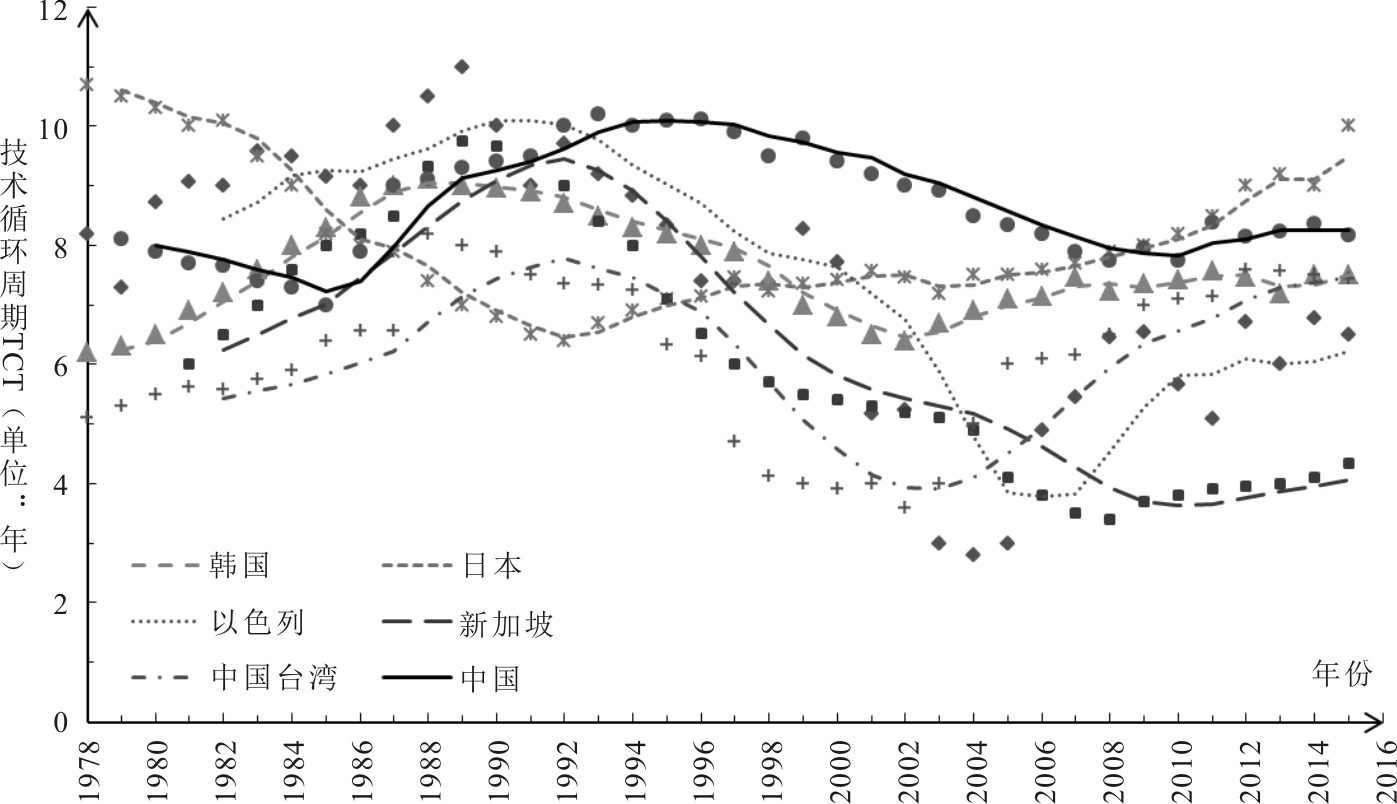 韩国于1988年达到中等收入水平,1995年进入发达国家行列,历时8年,是跨越中等收入陷阱较快的国家。据Lee[20]研究,20世纪60年代韩国经济向劳动力密集型产业方向发展,出现技术循环长周期趋势;70~80年代转移到中短周期低端电子消费品和汽车组装产业,进而转移到短周期电子通讯设备行业;90年代发展到储存器、手机和数字电视等更新更快、周期更短的行业。进入21世纪,韩国经济更加成熟,技术循环周期开始增长(见图1)。