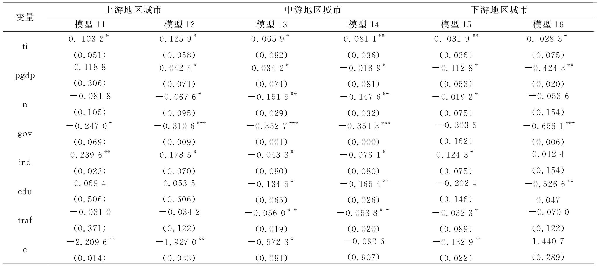 变量上游地区城市中游地区城市下游地区城市模型11模型12模型13模型14模型15模型16ti0. 103 2*(0.051)0.125 9*(0.058)0.065 9*(0.082)0.081 1**(0.036)0. 031 9**(0.036)0. 028 3*(0.075)pgdp0.118 8(0.306)0.042 4*(0.071)0.034 2*(0.074)-0.018 9*(0.081)-0.112 8*(0.053)-0.424 3**(0.020)n-0.081 8(0.105)-0.067 6*(0.095)-0.151 5**(0.029)-0.147 6**(0.032)-0.019 2*(0.075)-0.053 6(0.154)gov-0.247 0*(0.069)-0.310 6***(0.009)-0.352 7***(0.001)-0.351 3***(0.000)-0.303 5(0.162)-0.656 1***(0.006)ind0.239 6**(0.023)0.178 5*(0.070)-0.043 3*(0.080)-0.076 1*(0.080)0.124 3*(0.075)0.012 4(0.154)edu0.069 4(0.506)0.053 5(0.606)-0.134 5*(0.065)-0.165 4**(0.026)-0.202 4(0.146)-0.526 6**0.047traf-0.031 0(0.371)-0.034 2(0.122)-0.056 0**(0.019)-0.053 8**(0.020)-0.032 3*(0.089)-0.070 0(0.122)c-2.209 6**(0.014)-1.927 0**(0.033)-0.572 3*(0.081)-0.092 6(0.907)-0.132 9**(0.022)1.440 7(0.289)