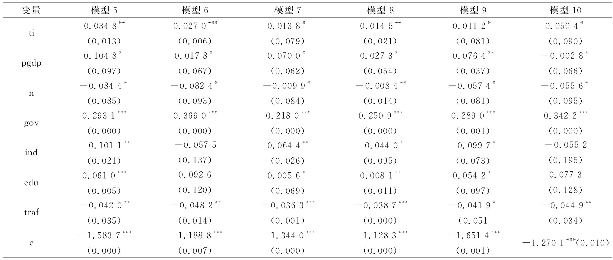 变量模型5模型6模型7模型8模型9模型10ti0.034 8**(0.013)0.027 0***(0.006)0.013 8*(0.079)0.014 5**(0.021)0.011 2*(0.081)0.050 4*(0.090)pgdp0.104 8*(0.097)0.017 8*(0.067)0.070 0*(0.062)0.027 3*(0.054)0.076 4**(0.037)-0.002 8*(0.066)n-0.084 4*(0.085)-0.082 4*(0.093)-0.009 9*(0.084)-0.008 4**(0.014)-0.057 4*(0.081)-0.055 6*(0.095)gov0.293 1***(0.000)0.369 0***(0.000)0.218 0***(0.000)0.250 9***(0.000)0.289 0***(0.001)0.342 2***(0.000)ind-0.101 1**(0.021)-0.057 5(0.137)0.064 4**(0.026)-0.044 0*(0.095)-0.099 7*(0.073)-0.055 2(0.195)edu0.061 0***(0.005)0.092 6(0.120)0.005 6*(0.069)0.008 1**(0.011)0.054 2*(0.097)0.077 3(0.128)traf-0.042 0**(0.035)-0.048 2**(0.014)-0.036 3***(0.001)-0.038 7***(0.000)-0.041 9*(0.051-0.044 9**(0.034)c-1.583 7***(0.000)-1.188 8***(0.007)-1.344 0***(0.000)-1.128 3***(0.000)-1.651 4***(0.001)-1.270 1***(0.010)