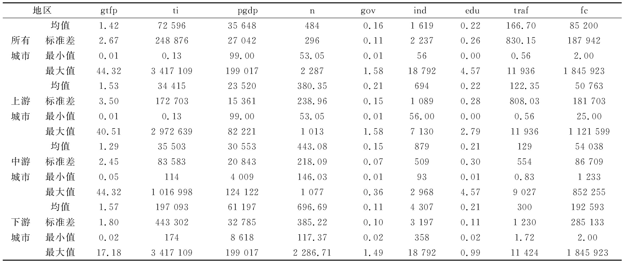 表1 长江经济带整体、上中下游地区城市各变量样本统计值