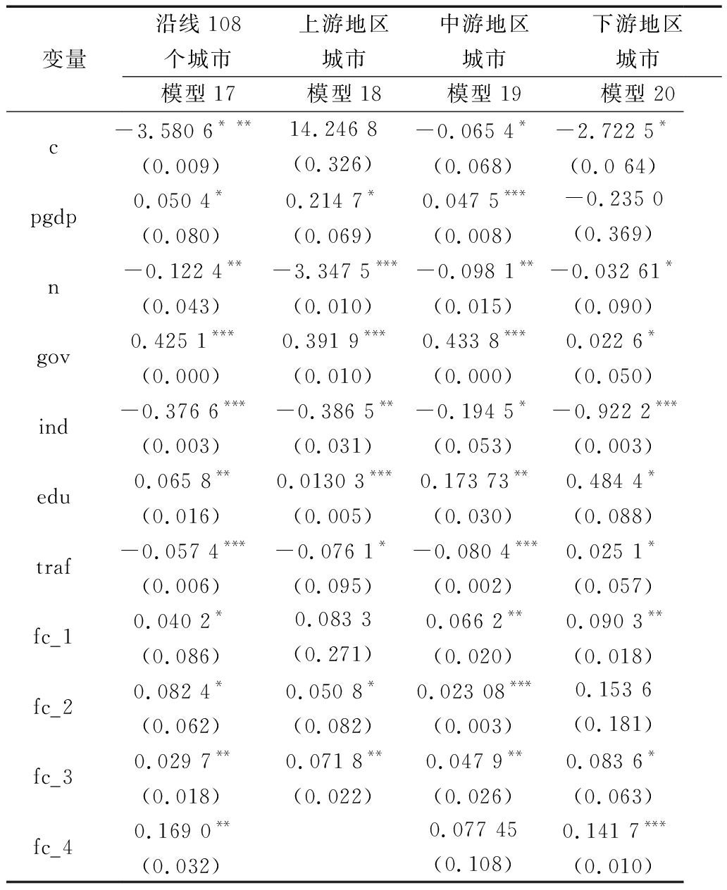变量沿线108个城市上游地区城市中游地区城市下游地区城市模型17模型18模型19模型20c-3.580 6***(0.009)14.246 8(0.326)-0.065 4*(0.068)-2.722 5*(0.0 64)pgdp0.050 4*(0.080)0.214 7*(0.069)0.047 5***(0.008)-0.235 0(0.369)n-0.122 4**(0.043)-3.347 5***(0.010)-0.098 1**(0.015)-0.032 61*(0.090)gov0.425 1***(0.000)0.391 9***(0.010)0.433 8***(0.000)0.022 6*(0.050)ind-0.376 6***(0.003)-0.386 5**(0.031)-0.194 5*(0.053)-0.922 2***(0.003)edu0.065 8**(0.016)0.0130 3***(0.005)0.173 73**(0.030)0.484 4*(0.088)traf-0.057 4***(0.006)-0.076 1*(0.095)-0.080 4***(0.002)0.025 1*(0.057)fc_10.040 2*(0.086)0.083 3(0.271)0.066 2**(0.020)0.090 3**(0.018)fc_20.082 4*(0.062)0.050 8*(0.082)0.023 08***(0.003)0.153 6(0.181)fc_30.029 7**(0.018)0.071 8**(0.022)0.047 9**(0.026)0.083 6*(0.063)fc_40.169 0**(0.032)0.077 45(0.108)0.141 7***(0.010)