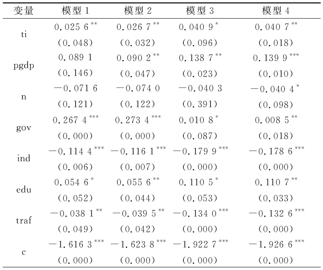 变量模型1模型2模型3模型4ti0.025 6**(0.048)0.026 7**(0.032)0.040 9*(0.096)0.040 7**(0.018)pgdp0.089 1(0.146)0.090 2**(0.047)0.138 7**(0.023)0.139 9***(0.010)n-0.071 6(0.121)-0.074 0(0.122)-0.040 3(0.391)-0.040 4*(0.098)gov0.267 4***(0.000)0.273 4***(0.000)0.010 8*(0.087)0.008 5**(0.018)ind-0.114 4***(0.006)-0.116 1***(0.007)-0.179 9***(0.000)-0.178 6***(0.000)edu0.054 6*(0.052)0.055 6**(0.044)0.110 5*(0.053)0.110 7**(0.033)traf-0.038 1**(0.049)-0.039 5**(0.042)-0.134 0***(0.000)-0.132 6***(0.000)c-1.616 3***(0.000)-1.623 8***(0.000)-1.922 7***(0.000)-1.926 6***(0.000)