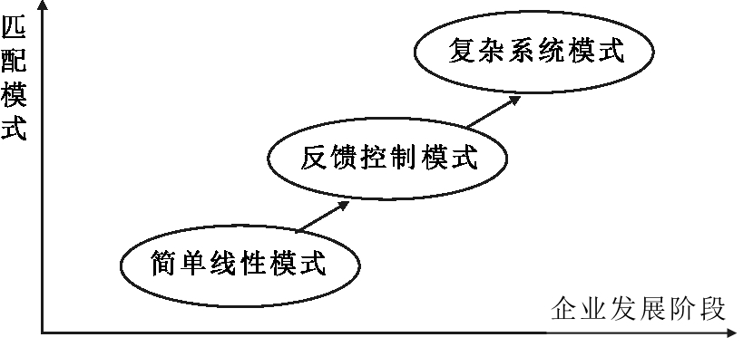 对TCL、比亚迪、小米的跨案例分析发现,技术创新和商业模式创新协同随着企业发展呈现动态变化。技术创新和商业模式创新在不同阶段主要存在3种模式:简单线性模式、反馈控制模式、复杂系统模式。在产业发展过程中,技术创新和商业模式创新协同的3种模式由初级的简单线性模式向高级的复杂系统模式演化,如图1所示。