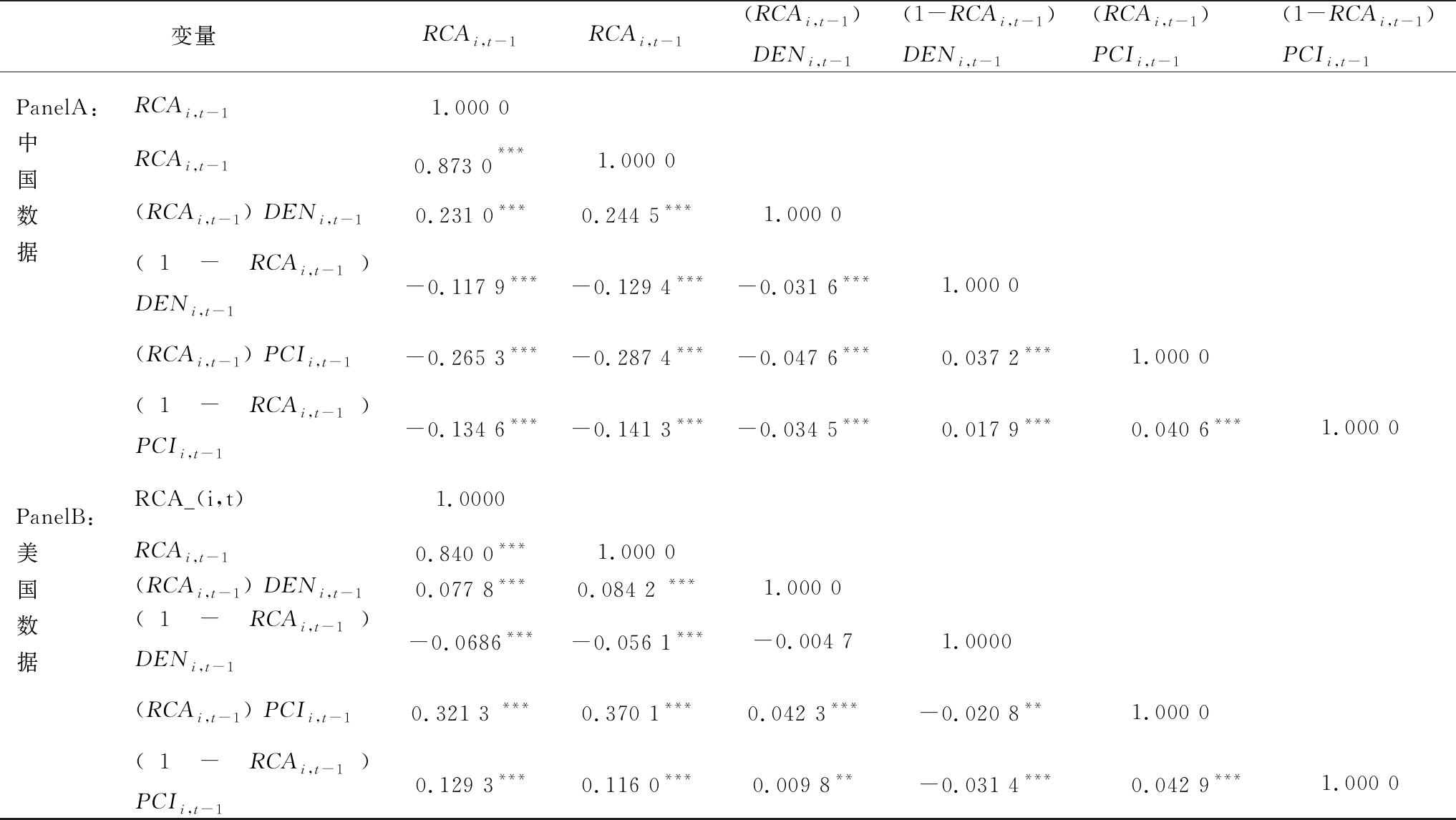 变量RCAi,t-1RCAi,t-1(RCAi,t-1)DENi,t-1(1-RCAi,t-1)DENi,t-1(RCAi,t-1)PCIi,t-1(1-RCAi,t-1)PCIi,t-1PanelA:中国数据RCAi,t-11.000 0RCAi,t-10.873 0***1.000 0(RCAi,t-1 ) DENi,t-10.231 0***0.244 5***1.000 0(1-RCAi,t-1 ) DENi,t-1-0.117 9***-0.129 4***-0.031 6***1.000 0(RCAi,t-1 ) PCIi,t-1-0.265 3***-0.287 4***-0.047 6***0.037 2***1.000 0(1-RCAi,t-1 ) PCIi,t-1-0.134 6***-0.141 3***-0.034 5***0.017 9***0.040 6***1.000 0PanelB:美国数据RCA_(i,t)1.0000RCAi,t-10.840 0***1.000 0(RCAi,t-1) DENi,t-10.077 8***0.084 2 ***1.000 0(1-RCAi,t-1 ) DENi,t-1-0.0686***-0.056 1***-0.004 71.0000(RCAi,t-1 ) PCIi,t-10.321 3 ***0.370 1***0.042 3***-0.020 8**1.000 0(1-RCAi,t-1 ) PCIi,t-10.129 3***0.116 0***0.009 8**-0.031 4***0.042 9***1.000 0