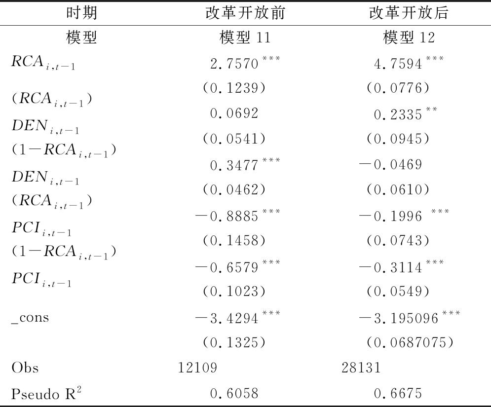 时期改革开放前改革开放后模型模型11模型12RCAi,t-12.7570***4.7594***(0.1239)(0.0776)(RCAi,t-1)DENi,t-10.06920.2335**(0.0541)(0.0945)(1-RCAi,t-1)DENi,t-10.3477***-0.0469(0.0462)(0.0610)(RCAi,t-1)PCIi,t-1-0.8885***-0.1996 ***(0.1458)(0.0743)(1-RCAi,t-1)PCIi,t-1-0.6579***-0.3114***(0.1023)(0.0549)_cons-3.4294***-3.195096***(0.1325)(0.0687075)Obs1210928131Pseudo R20.60580.6675