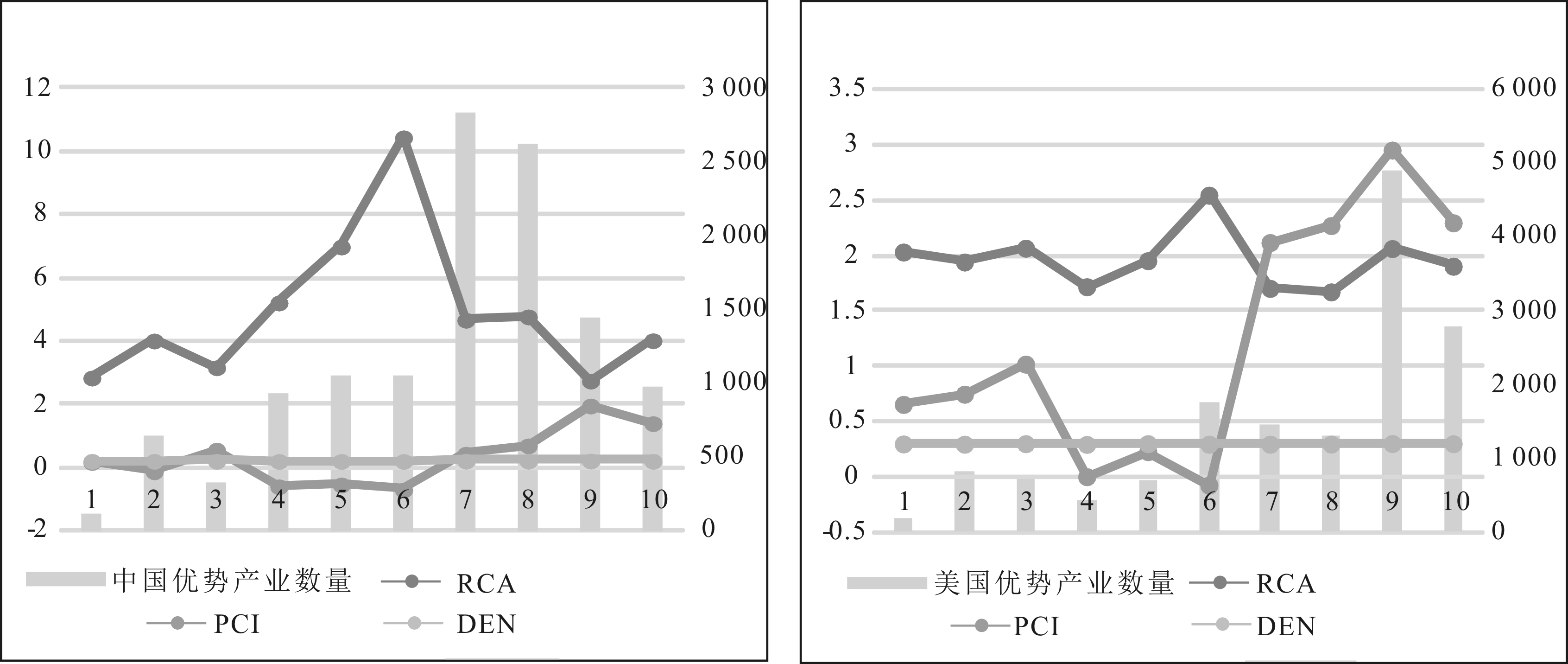 图3 中美产业DEN比较 图4 中美产业RCA比较
