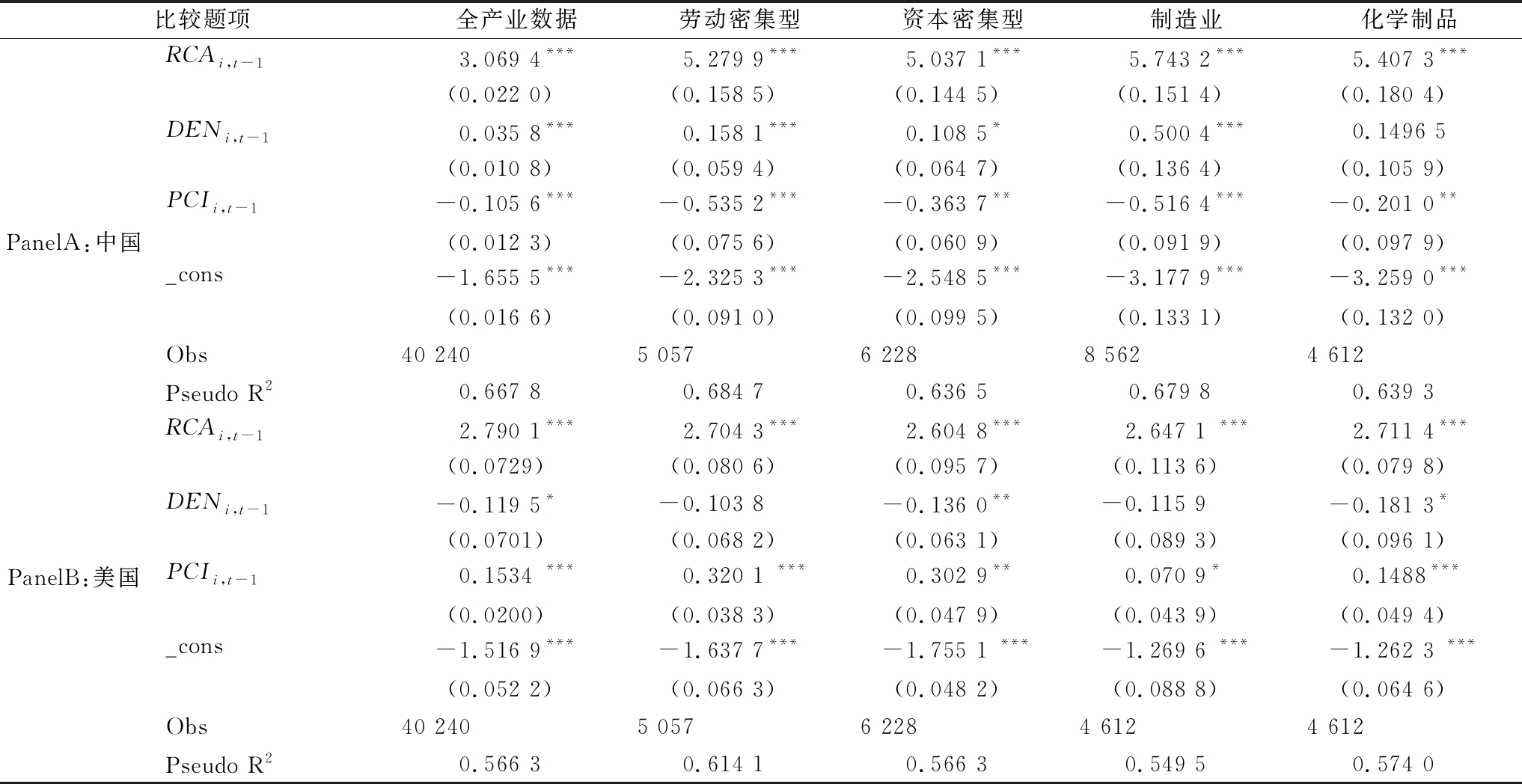 比较题项全产业数据劳动密集型资本密集型制造业化学制品RCAi,t-13.069 4***5.279 9***5.037 1***5.743 2***5.407 3***(0.022 0)(0.158 5)(0.144 5)(0.151 4)(0.180 4)DENi,t-10.035 8***0.158 1***0.108 5*0.500 4***0.1496 5(0.010 8)(0.059 4)(0.064 7)(0.136 4)(0.105 9)PCIi,t-1-0.105 6***-0.535 2***-0.363 7**-0.516 4***-0.201 0**PanelA:中国(0.012 3)(0.075 6)(0.060 9)(0.091 9)(0.097 9)_cons-1.655 5***-2.325 3***-2.548 5***-3.177 9***-3.259 0***(0.016 6)(0.091 0)(0.099 5)(0.133 1)(0.132 0)Obs40 2405 0576 2288 5624 612Pseudo R20.667 80.684 70.636 50.679 80.639 3RCAi,t-12.790 1***2.704 3***2.604 8***2.647 1 ***2.711 4***(0.0729)(0.080 6)(0.095 7)(0.113 6)(0.079 8)DENi,t-1-0.119 5*-0.103 8-0.136 0**-0.115 9-0.181 3*(0.0701)(0.068 2)(0.063 1)(0.089 3)(0.096 1)PanelB:美国PCIi,t-10.1534 ***0.320 1 ***0.302 9**0.070 9*0.1488***(0.0200)(0.038 3)(0.047 9)(0.043 9)(0.049 4)_cons-1.516 9***-1.637 7***-1.755 1 ***-1.269 6 ***-1.262 3 ***(0.052 2)(0.066 3)(0.048 2)(0.088 8)(0.064 6)Obs40 2405 0576 2284 6124 612Pseudo R20.566 30.614 10.566 30.549 50.574 0