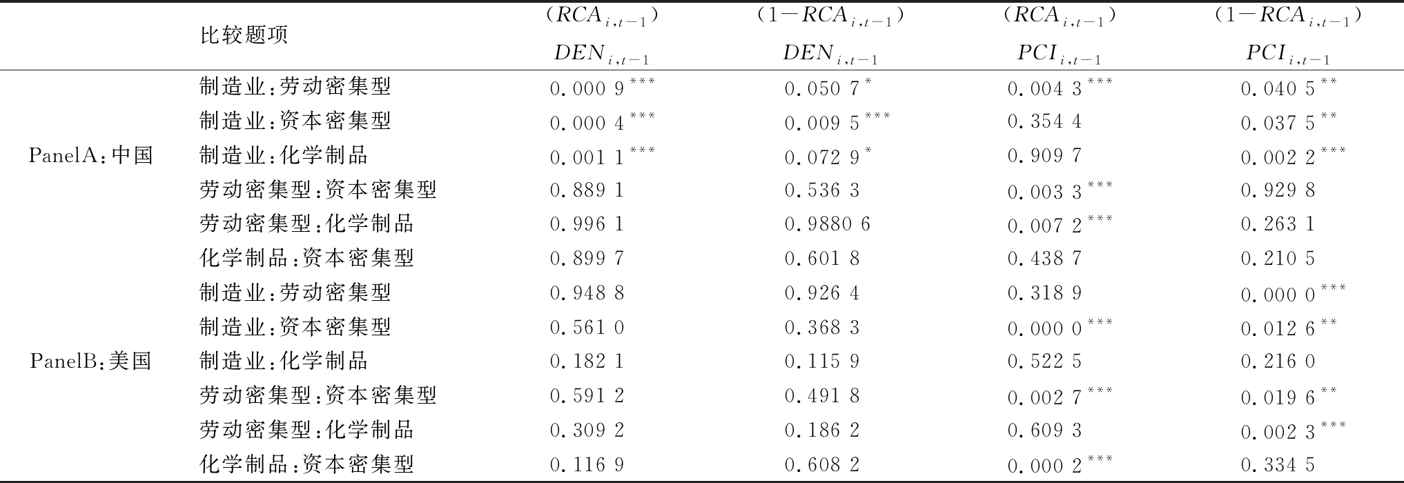 比较题项(RCAi,t-1)DENi,t-1(1-RCAi,t-1)DENi,t-1(RCAi,t-1)PCIi,t-1(1-RCAi,t-1)PCIi,t-1制造业:劳动密集型0.000 9***0.050 7*0.004 3***0.040 5**制造业:资本密集型0.000 4***0.009 5***0.354 40.037 5**PanelA:中国制造业:化学制品0.001 1***0.072 9*0.909 70.002 2***劳动密集型:资本密集型0.889 10.536 30.003 3***0.929 8劳动密集型:化学制品0.996 10.9880 60.007 2***0.263 1化学制品:资本密集型0.899 70.601 80.438 70.210 5制造业:劳动密集型0.948 80.926 40.318 90.000 0***制造业:资本密集型0.561 00.368 30.000 0***0.012 6**PanelB:美国制造业:化学制品0.182 10.115 90.522 50.216 0劳动密集型:资本密集型0.591 20.491 80.002 7***0.019 6**劳动密集型:化学制品0.309 20.186 20.609 30.002 3***化学制品:资本密集型0.116 90.608 20.000 2***0.334 5