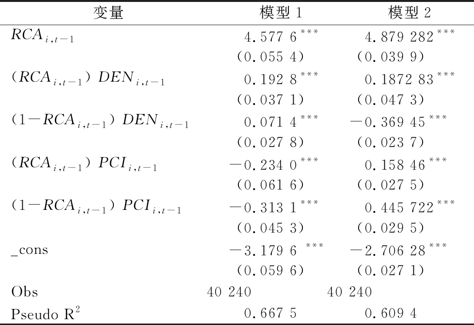 变量模型1模型2RCAi,t-14.577 6***4.879 282***(0.055 4)(0.039 9)(RCAi,t-1 ) DENi,t-10.192 8***0.1872 83***(0.037 1)(0.047 3)(1-RCAi,t-1 ) DENi,t-10.071 4***-0.369 45***(0.027 8)(0.023 7)(RCAi,t-1 ) PCIi,t-1-0.234 0***0.158 46***(0.061 6)(0.027 5)(1-RCAi,t-1 ) PCIi,t-1-0.313 1***0.445 722***(0.045 3)(0.029 5)_cons-3.179 6 ***-2.706 28***(0.059 6)(0.027 1)Obs40 24040 240Pseudo R20.667 50.609 4