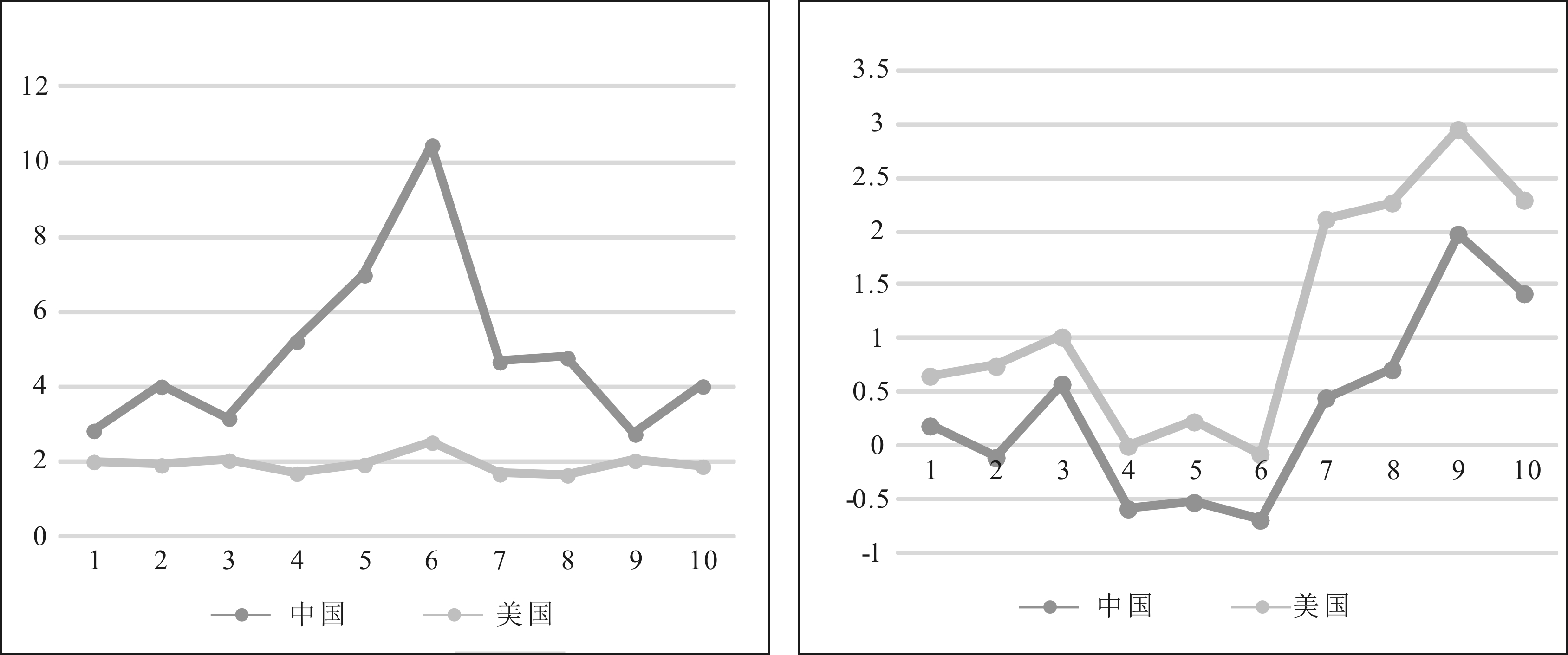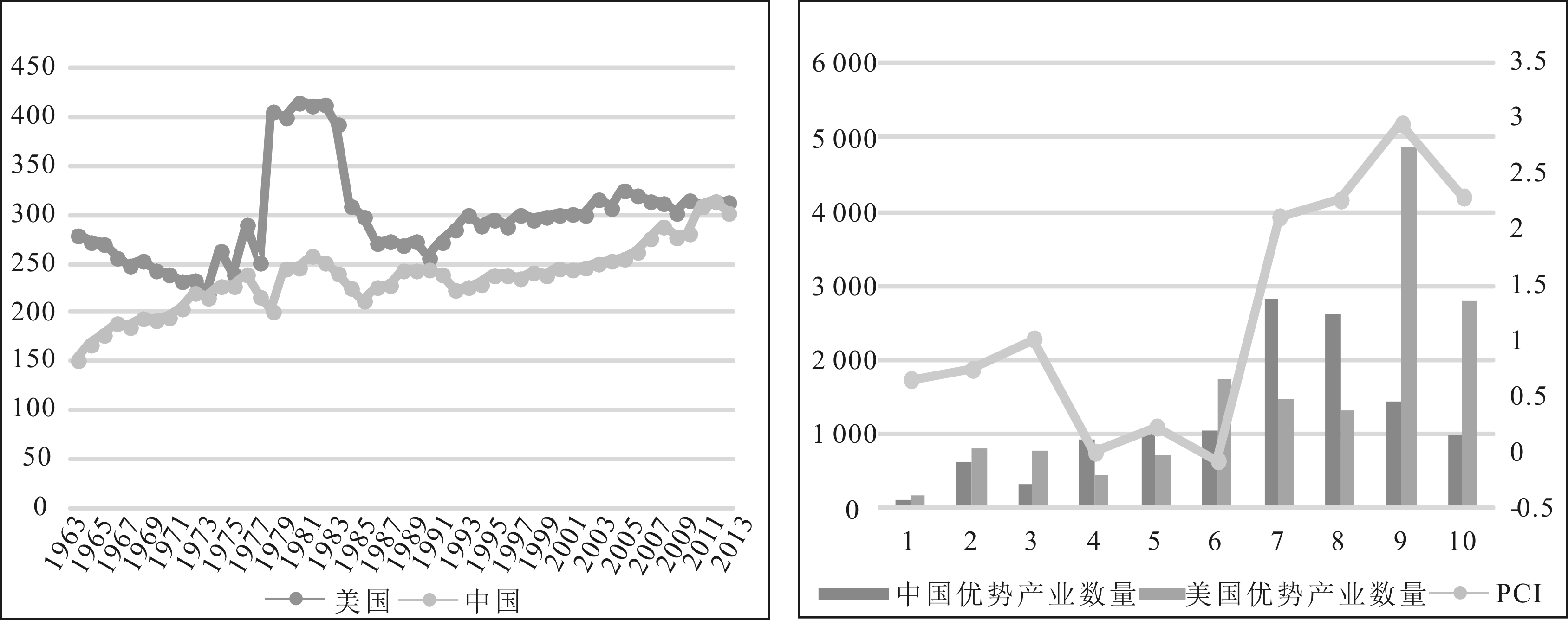 图1 中美优势产业数量变化比较 图2 中美优势产业数量比较与PCI指标