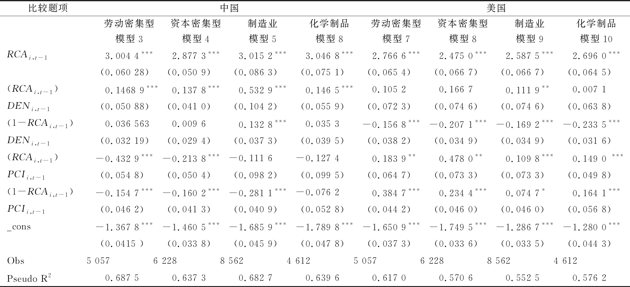 比较题项中国美国劳动密集型资本密集型制造业化学制品劳动密集型资本密集型制造业化学制品模型3模型4模型5模型8模型7模型8模型9模型10RCAi,t-13.004 4***2.877 3***3.015 2***3.046 8***2.766 6***2.475 0***2.587 5***2.696 0***(0.060 28)(0.050 9)(0.086 3)(0.075 1)(0.065 4)(0.066 7)(0.066 7)(0.064 5)(RCAi,t-1 )0.1468 9***0.137 8***0.532 9***0.146 5***0.105 20.166 70.111 9**0.007 1DENi,t-1(0.050 88)(0.041 0)(0.104 2)(0.055 9)(0.072 3)(0.074 6)(0.074 6)(0.063 8)(1-RCAi,t-1 )0.036 5630.009 60.132 8***0.035 3-0.156 8***-0.207 1***-0.169 2***-0.233 5***DENi,t-1(0.032 19)(0.029 4)(0.037 3)(0.039 5)(0.038 2)(0.034 9)(0.034 9)(0.031 6)(RCAi,t-1 )-0.432 9***-0.213 8***-0.111 6-0.127 4 0.183 9**0.478 0**0.109 8***0.149 0 ***PCIi,t-1(0.054 8)(0.050 4)(0.098 2)(0.099 5)(0.064 7)(0.073 3)(0.073 3)(0.049 8)(1-RCAi,t-1 )-0.154 7***-0.160 2***-0.281 1***-0.076 20.384 7***0.234 4***0.074 7*0.164 1***PCIi,t-1(0.046 2)(0.041 3)(0.040 9)(0.052 8)(0.044 2)(0.046 0)(0.046 0)(0.056 8)_cons-1.367 8***-1.460 5***-1.685 9***-1.789 8***-1.650 9***-1.749 5***-1.286 7***-1.280 0***(0.0415 )(0.033 8)(0.045 9)(0.047 8)(0.037 3)(0.033 6)(0.033 5)(0.044 3)Obs5 0576 2288 5624 6125 0576 2288 5624 612Pseudo R20.687 50.637 30.682 70.639 60.617 00.570 60.552 50.576 2