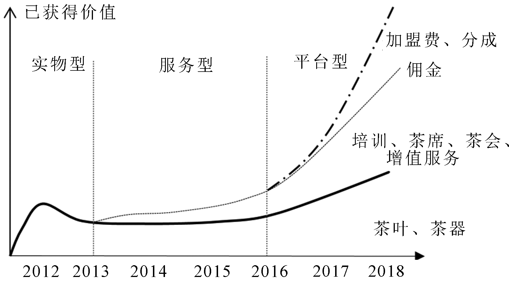 为构建平台型商业模式,对标大众点评等平台型企业,使经营业务从服务领域扩展为互联网+文化产业领域。在规划设计阶段,考虑品牌价值和平台属性,构建“第五代”新兴茶馆模式。一方面是延伸线下实物产品和服务,扩大品牌影响力,同时为平台增加流量。通过加盟、合作和接手运营,大士茶亭发挥主体平台优势,盈利机制逐渐成熟。另一个战略布局是“去雅室”平台项目,吸引文化空间提供方加入平台,构建文化产业系列商业共同体。虽然通过平台业务可以获取收益,但大士茶亭不依赖于平台,将战略目光投向“产品+服务+平台”,打造一体化商业系统,将线下线上紧密融合,争取为合作伙伴降低运营成本,同时扩大双方价值空间,提升产品和服务品质,增强顾客体验感以吸纳更多创意,完善已有业务,深度挖掘顾客需求,进而提供更具特色的产品和服务。虽然“去雅室”平台以失败告终,但创业者进行了试错性学习并敢于实践,使大士茶亭的平台属性凸显出来,伴随老门东和砂之船分店的开张运营,大士茶亭平台型商业模式在实践中逐渐成型。之后大士茶亭不断动态调整现有商业模式,价值获取逐渐成为企业寻求可持续发展的核心任务。
